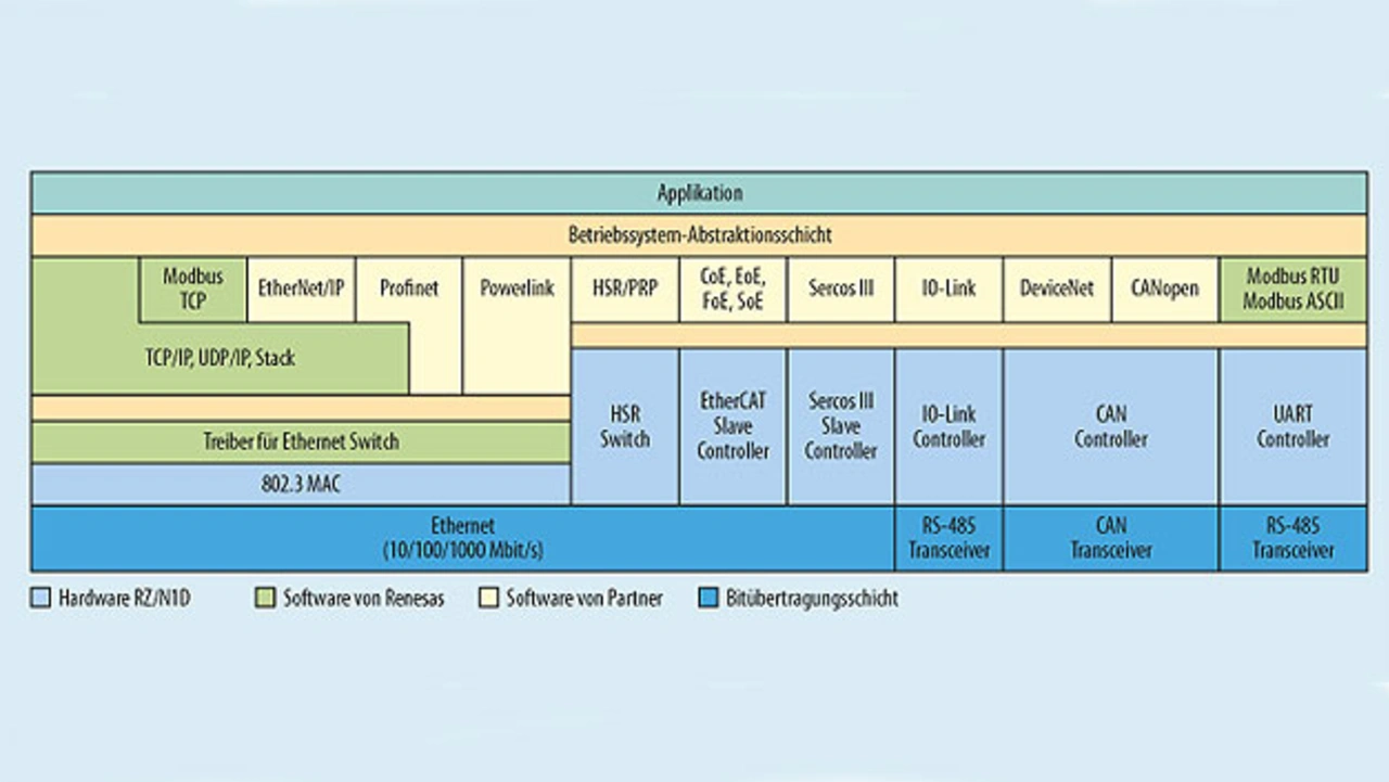 Die bereits etablierte R-IN Engine (Renesas Industrial Network), die schon in einigen Mikrocontrollerfamilien als unabhängiger Block eingesetzt wird, bildet in der RZ/N1-Familie den Kommunikationsblock. Sie bietet Echtzeitfähigkeit vereint mit geringer Leistungsaufnahme. In ihr ist eine ARM-CPU des Typs Cortex-M3 verbaut, die von Hardware-Beschleunigern unterstützt wird und so eine effizientere, echtzeitfähige Kommunikation mit kurzen Zykluszeiten in Industrie-4.0-Anwendungen erlaubt: geringer Jitter, möglichst kleine und konstante Verzögerungen sowie isochrones Verhalten mit identischer Zeitbasis für synchrone Prozesse in allen Netzwerkknoten.