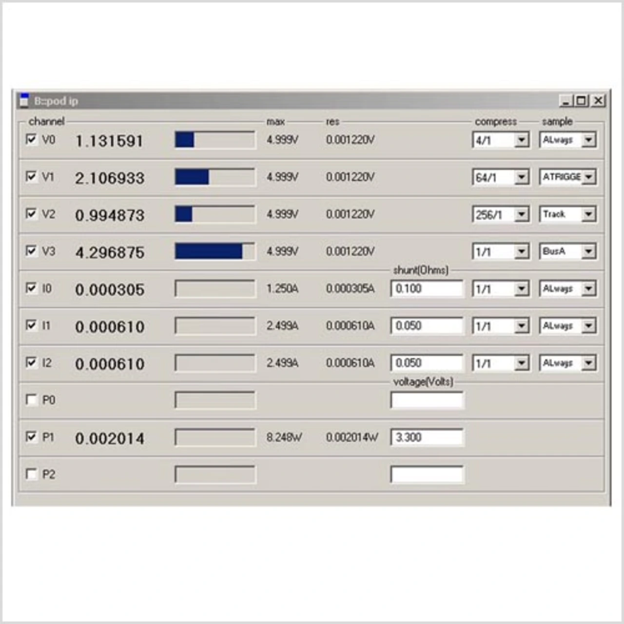 Strom- und Spannungskanäle sowie die Werte der Shunt-Widerstände werden in einem Eingabefenster aktiviert (Bild 1). Gleiches gilt für die Leistungskanäle, deren Berechnung aus dem gemessenen Strom und der gemessenen Spannung erfolgt. Alternativ kann auch eine feste Spannung für die Berechnung angegeben werden. Strom und Spannung lassen sich ebenso wie die daraus berechnete Leistung als zeitabhängige Kurven oder Tabellen darstellen. Alle zeitabhängigen Darstellungen (Programmfluss, Chart, Strom, Spannung, Leistung) werden durch die Track-Funktion synchronisiert. Bei einem Maus-Klick in eines der Fenster werden alle anderen Darstellungen automatisch nachgeführt. Durch diese enge Kopplung lassen sich die Ursachen einer hohen Leistungsaufnahme schnell der entsprechenden Programmstelle zuordnen.