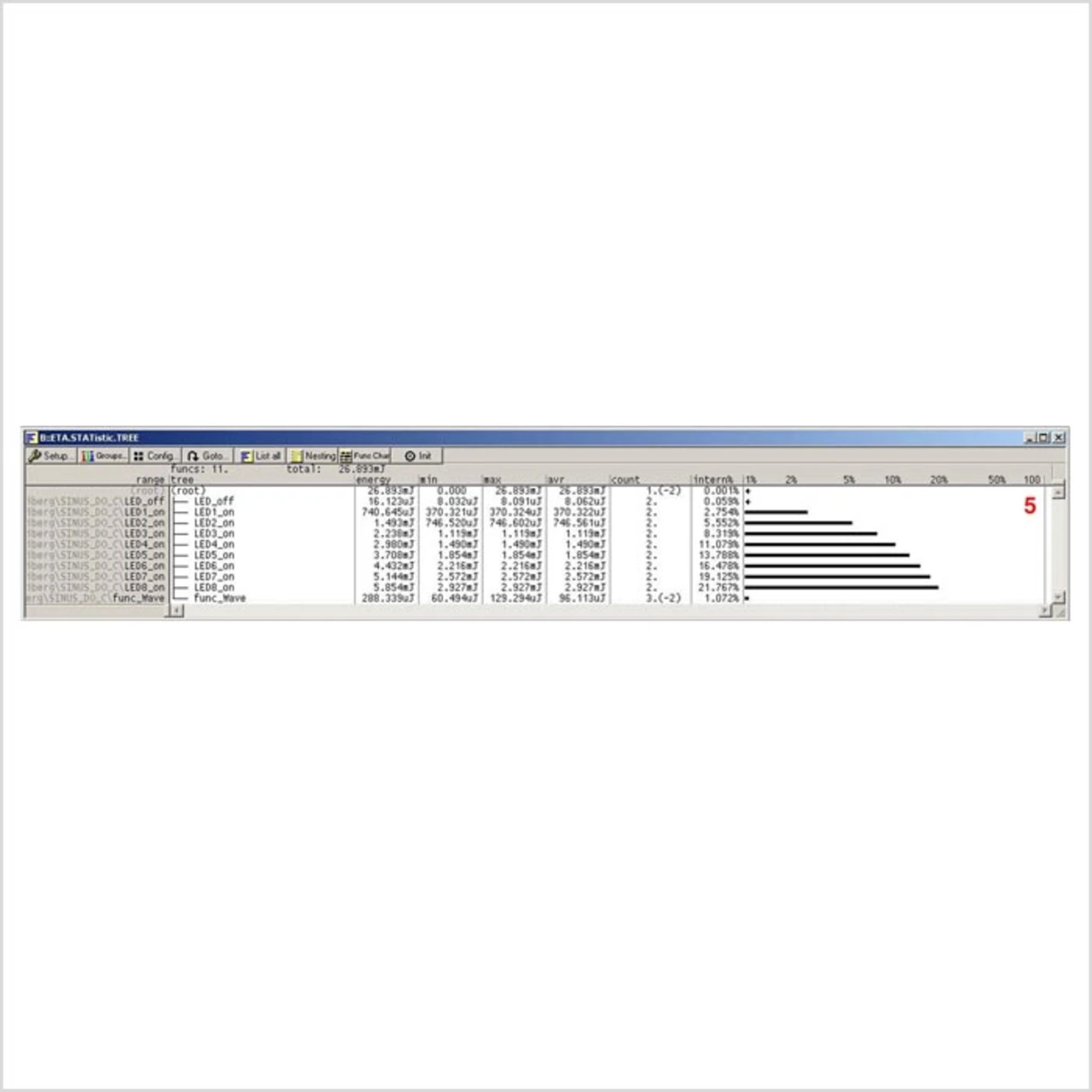 Statistische Auswertungen werden nach jedem Programmstop automatisch ausgeführt. Sie liefern Informationen über Minimal-, Maximal- und Mittelwert des Energieverbrauchs der ausgeführten Funktionen (Bild 3). Ebenso wird für jede Funktion der absolute und der prozentuale Anteil am Gesamt-Energieverbrauch ermittelt. Energiehungrige Programmteile sind damit sehr leicht zu erkennen. In ihnen steckt das größte Potential zur Energieeinsparung. Die statistische Auswertung zeigt den Energieverbrauch der einzelnen Funktionen. Im Balkendiagramm (5) ist zu erkennen, dass die Funktion „LED8_on“ (alle LEDs an) den höchsten Energieverbrauch hat.