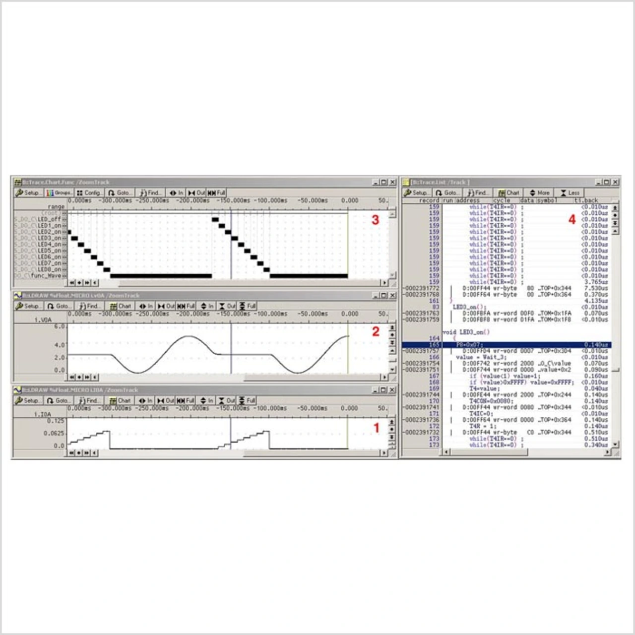 förmig ansteigende Stromverbrauch dargestellt. Die Sinusspannung ist in der Spannungs-Zeit-Kurve (2) zu erkennen. In der Strom- (1), Spannungs- (2) und Chart-Darstellung (3) ist die Funktion „LED3_on“ durch die senkrechte, schwarze Track-Linie markiert. Im „Trace.List“-Fenster (4) ist die entsprechende Programmzeile durch einen blauen Balken gekennzeichnet.