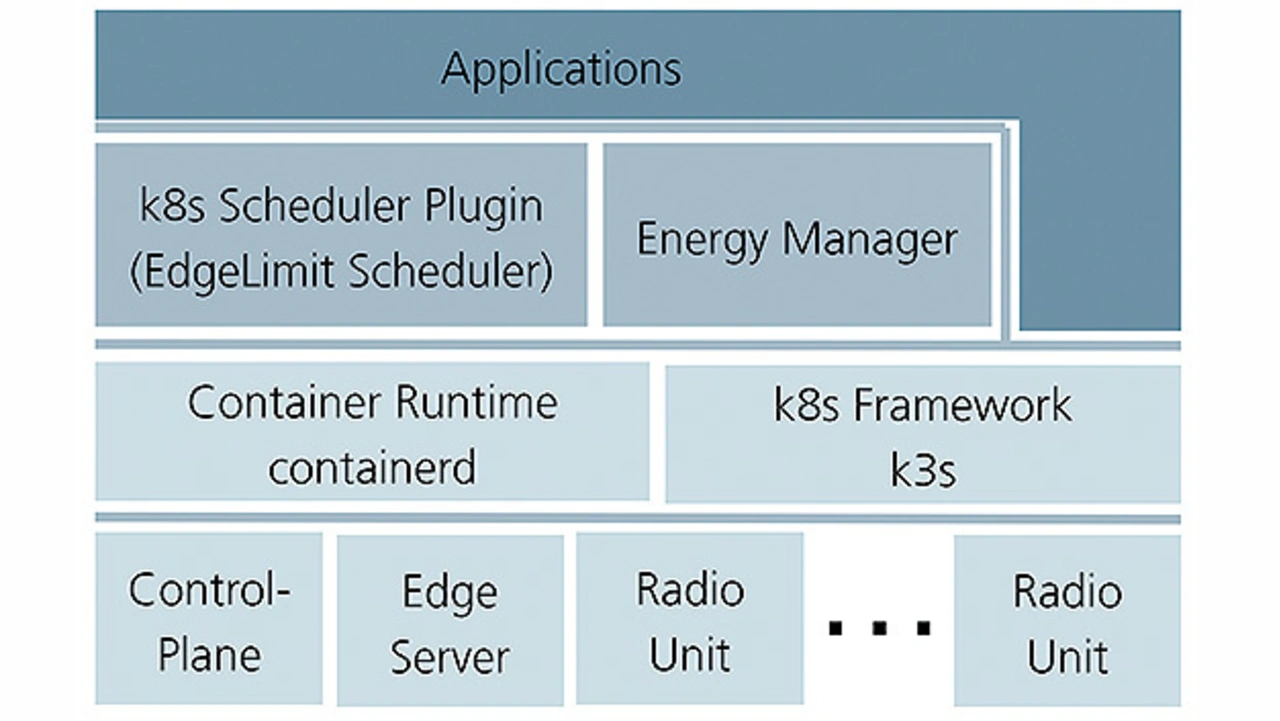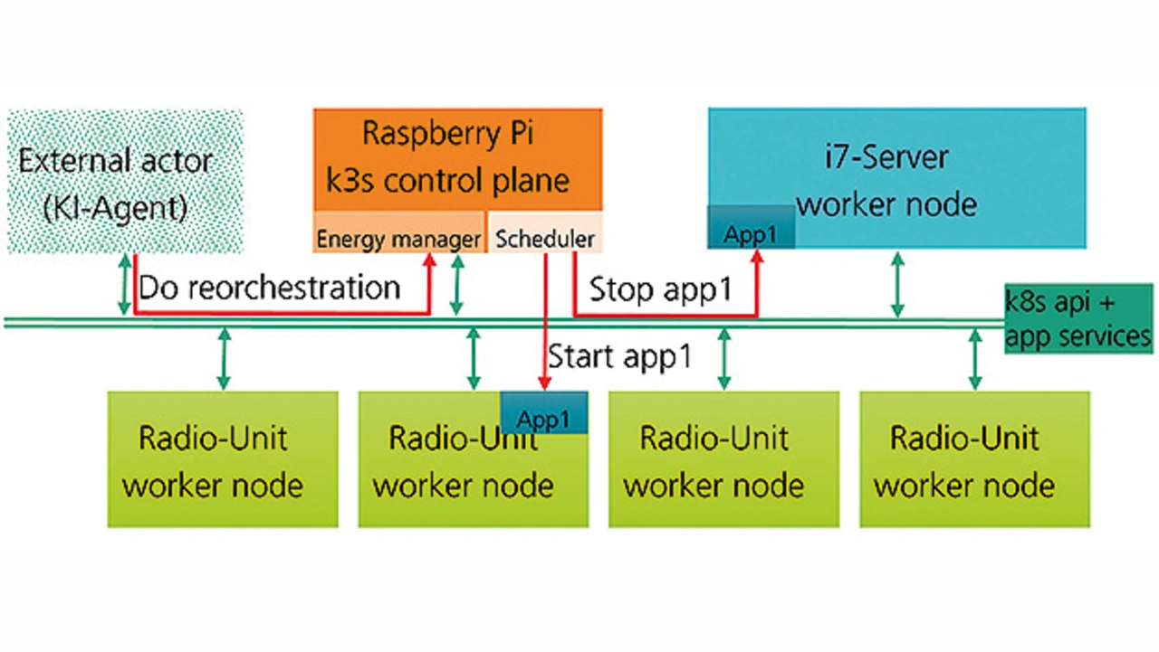Für die Entwicklung und den Test einer energieeffizienten Orchestrierung wurde ein K8s-Cluster aufgebaut, bestehend aus einer Control-Plane, einem Edge-Server und 4 Arm-basierten, in Form von XILINX-Evaluationsboards emulierten Recheneinheiten von 5G-Radio-Units. Die Control-Plane dient als Verwaltungseinheit des Clusters, während der Edge-Server und die Radio-Units die sogenannten Worker-Nodes darstellen. Sie führen die eigentlichen Anwendungen aus. Bild 6 zeigt die einzelnen Komponenten in Form eines Stack.