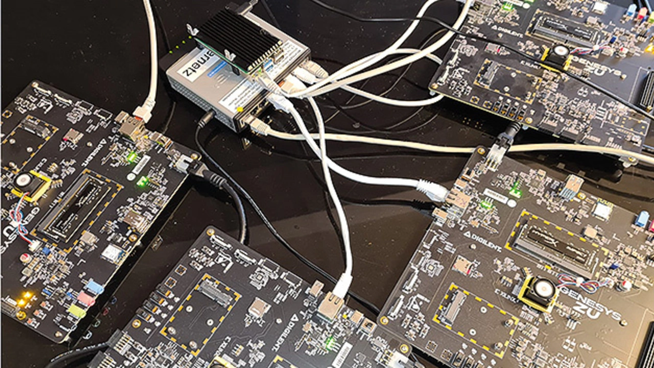 Um die Energieeffizienz der neuartigen energieeffizienten Orchestrierung zu zeigen, wurde ein kleines Testbed aufgebaut. Bild 8 zeigt einen Teil des verteilten Clusters bestehend aus den vier Evaluationsboards für die FPGA-SoCs und einem Raspberry PI, der auf dem Ethernet Switch liegt.