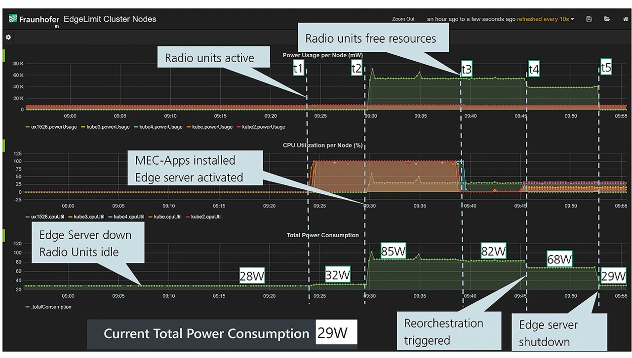 An dieser Stelle ist ein Vergleich der Zeitabschnitte vor t1 und nach t5 interessant. Der Unterschied sind die 9 MEC-Anwendungen, die nach t5 auf den Radio-Units verteilt sind und eine Leistungsaufnahme von ca. 1 W produzieren. Die gleichen Anwendungen laufen im Zeitabschnitt zwischen t3 und t4 auf dem Edge-Server und haben eine Leistungsaufnahme von ca. 14 W produziert, dabei ist die Serverbereitschaft, die dafür notwendig geworden ist und ca. 39 W benötigt, noch nicht berücksichtigt.
