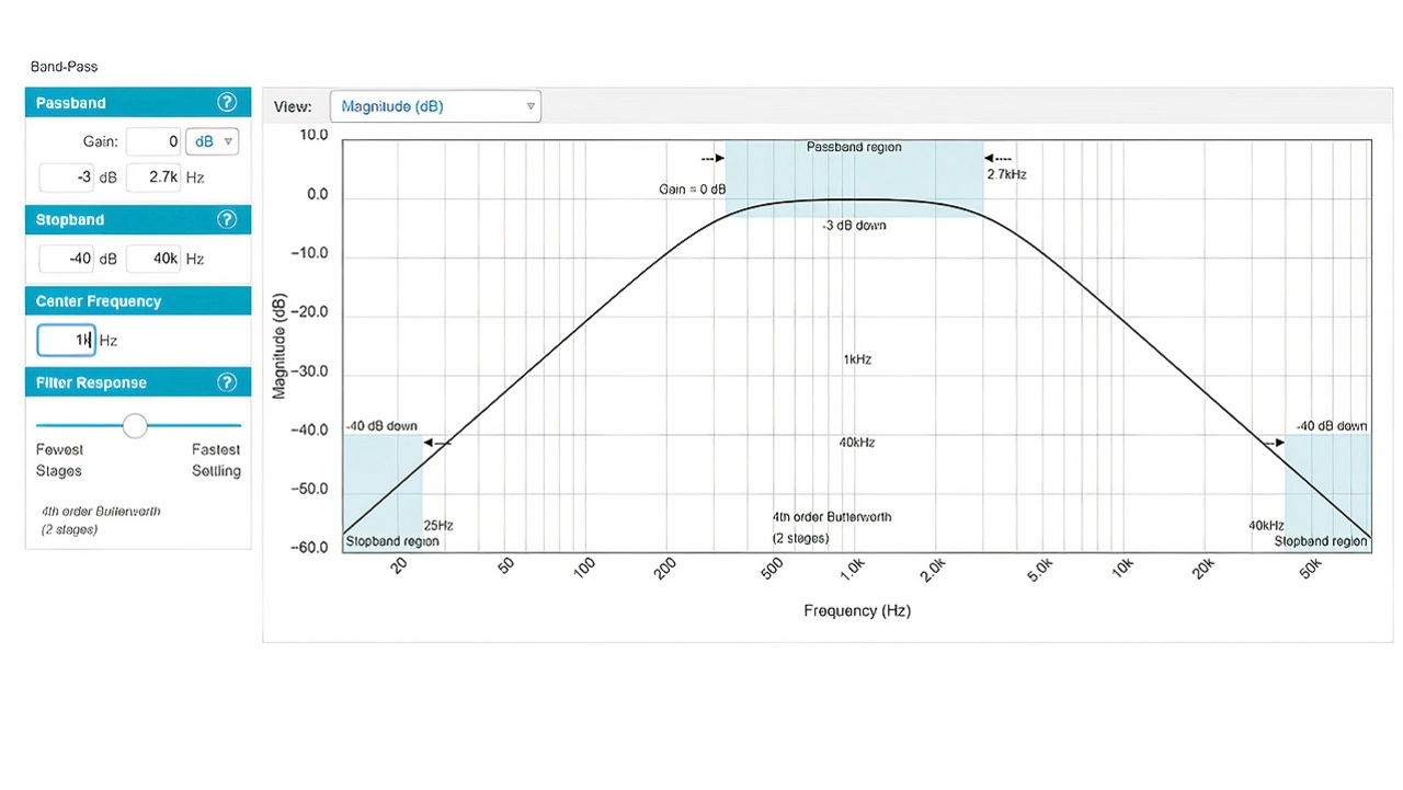 Das beschriebene Verfahren bei der Entwicklung von Analogfiltern dürfte vielen bekannt sein, aber die heutige Realität sieht dank der Verfügbarkeit von Softwaretools wie dem Analog Filter Wizard von Analog Devices ganz anders aus. Diese Software ermöglicht die vollständige Automatisierung der Filterentwicklung von der Auswahl der initialen Filterschaltung bis hin zum Prototyping in der Praxis. Nachdem der Entwickler eine erste Filterauswahl – Tiefpass, Hochpass oder Bandpass – getroffen hat, gibt er nur noch die Filterspezifikationen ein. Am Bildschirm erfolgt dann eine visuelle Darstellung des Filterfrequenzgangs (Bild 2).
