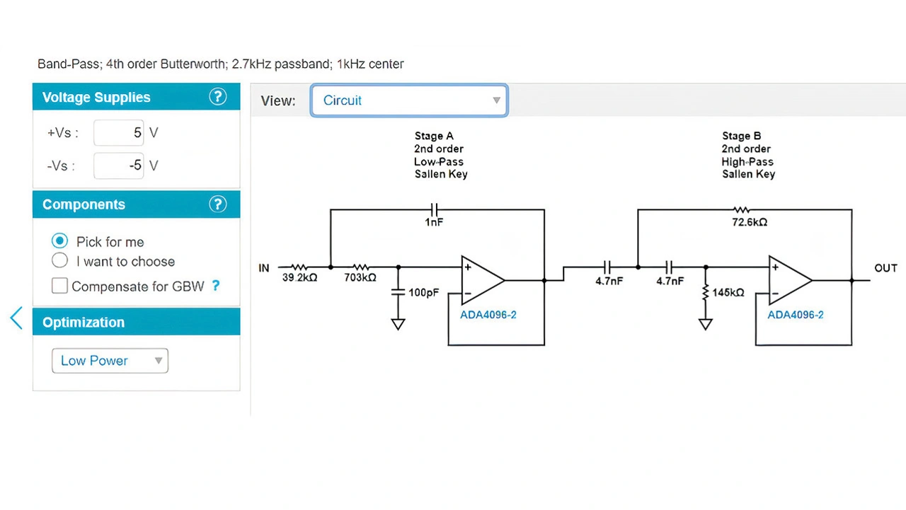 Nachdem die gewünschte Frequenzkurve bestimmt wurde, zeigt das Tool automatisch die Schaltung an, mit der diese Frequenzkurve erzielt wird (Bild 3). Der Entwickler muss die Übertragungsfunktionen nicht manuell mit den Tabellen der verschiedenen Filtertypen abgleichen.