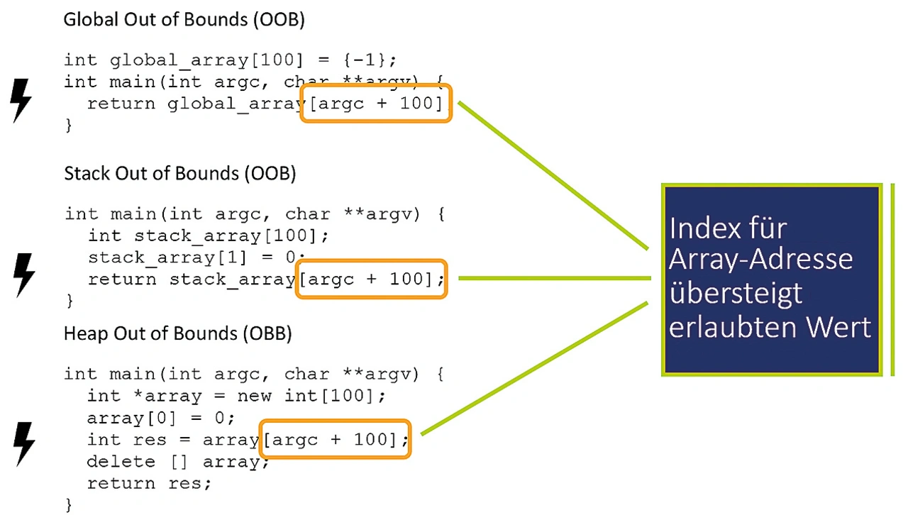 Daten können an einen falschen Ort im Speicherbereich geschrieben/gelesen werden, wenn ihre Größe den zugewiesenen Speicherbereich überschreitet, was zu einem Pufferüberlauf führt, oder wenn das Programm die Datengröße oder die Adresse falsch berechnet. Das tritt beispielsweise auf, wenn ein Programm versucht, auf einen ungültigen Index in einem Array zuzugreifen, d. h. einen Index, der kleiner als 0 oder gleich oder größer als der Umfang des Arrays ist.