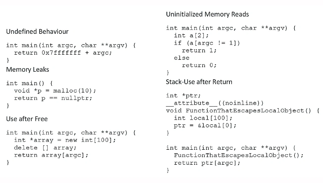 ➔ Undefiniertes Verhalten: Beispiele für undefiniertes Verhalten sind der Überlauf von vorzeichenbehafteten Ganzzahlen, die Dereferenzierung von Null-Pointern, die mehrfache Änderung desselben Skalars in einem Ausdruck ohne Sequenzpunkte und der Zugriff auf ein Objekt über einen Pointer eines anderen Typs.