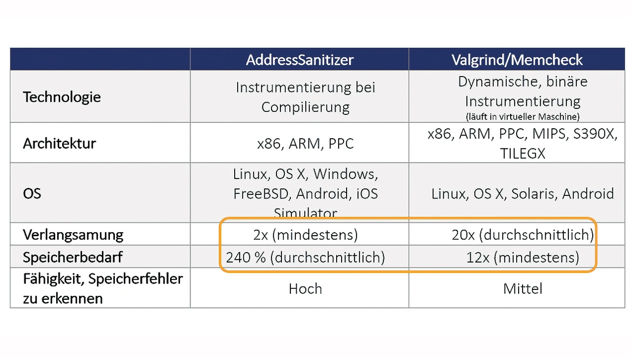 Zur Vermeidung von Speicherfehlern in C/C++-Code gibt es bereits eine Reihe von dynamischen Code-Analyse-Tools, von denen die beiden in Bild 3 gezeigten die bekanntesten sind: Valgrind und AddressSanitizer oder kurz ASan. Beide sind für verschiedene CPU-Architekturen verfügbar und instrumentieren den Code auf unterschiedliche Weise. Die damit verbundene Verlangsamung und der erhöhte Speicherbedarf verbietet aber die Verwendung beider Tools für Embedded-Echtzeitanwendungen.