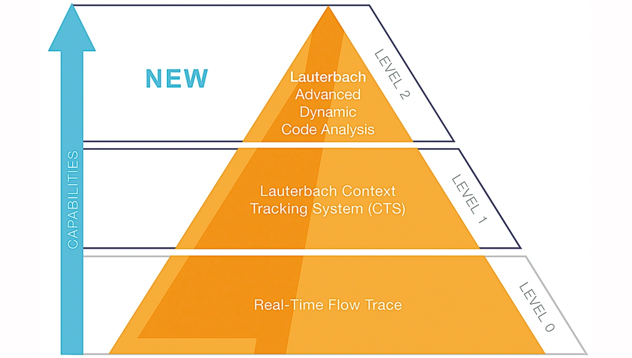 Wenn die vorhandenen Instrumente für Entwickler von Embedded-Software nicht brauchbar sind, stellt sich sofort die Frage, was tun. Bild 4 zeigt die Lauterbach-Trace-Pyramide mit der neuen ADCA-Technik an der Spitze. ADCA basiert auf Lauterbachs Context Tracking System (CTS), das wiederum auf einem Standard-Echtzeit-Flow-Trace basiert.