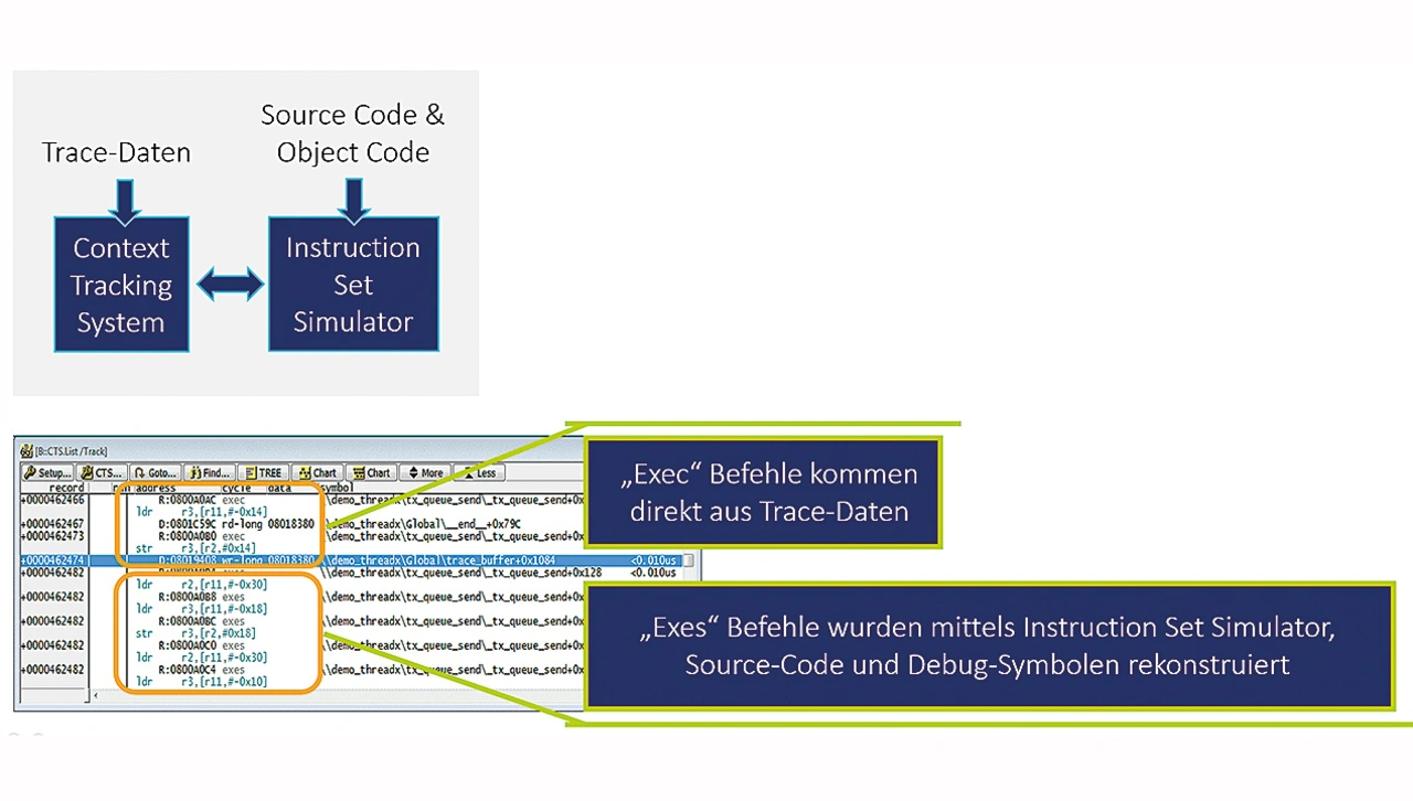 Sie verfügen daher zusätzlich zur Debug-Schnittstelle über eine spezielle Trace-Schnittstelle auf dem Chip. Diese macht den Programmablauf in komprimierter Form nach außen hin sichtbar (Bild 5). Dies wird als Flow-Trace-Verfahren bezeichnet.