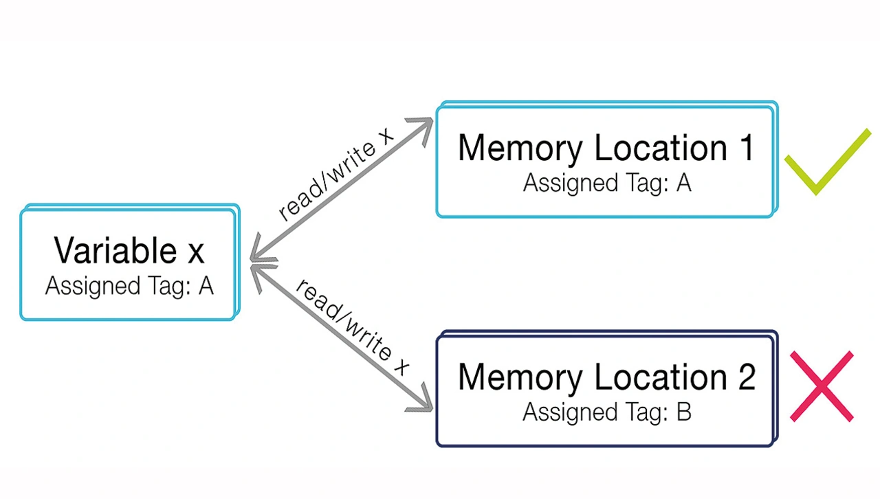 Die Kernfunktion ist eine Zuordnung von statischen und dynamischen Tags zu allen Daten und Speicheradressen. Tags sind unsichtbare Metainformationen, die vom Debugger mitgezogen werden. Speicherverletzungen werden nach dem Schlüssel-Schloss-Prinzip erkannt: Ein Datum mit einem bestimmten Tag darf nur auf eine Speicheradresse zugreifen, die mit demselben Tag verbunden ist (Bild 7).