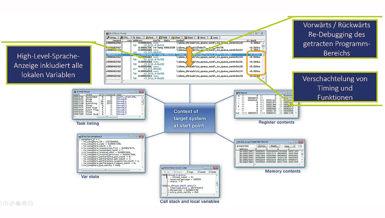 Lauterbachs Trace-basiertes Debugging (CTS) ermöglicht es dem Anwender, den Zustand des Zielsystems an einem ausgewählten Punkt auf Basis der im Trace-Speicher abgetasteten Informationen wiederherzustellen (Bild 6). Von diesem Ausgangspunkt aus können die zuvor in Echtzeit im Trace-Speicher aufgezeichneten Programmschritte in der TRACE32 PowerView GUI erneut auf Fehler untersucht werden. Voraussetzung für ein vollwertiges Trace-basiertes Debugging ist, dass der komplette Programm- und Datenfluss bis zum Stopp der Programmausführung im Trace-Buffer vorhanden ist.