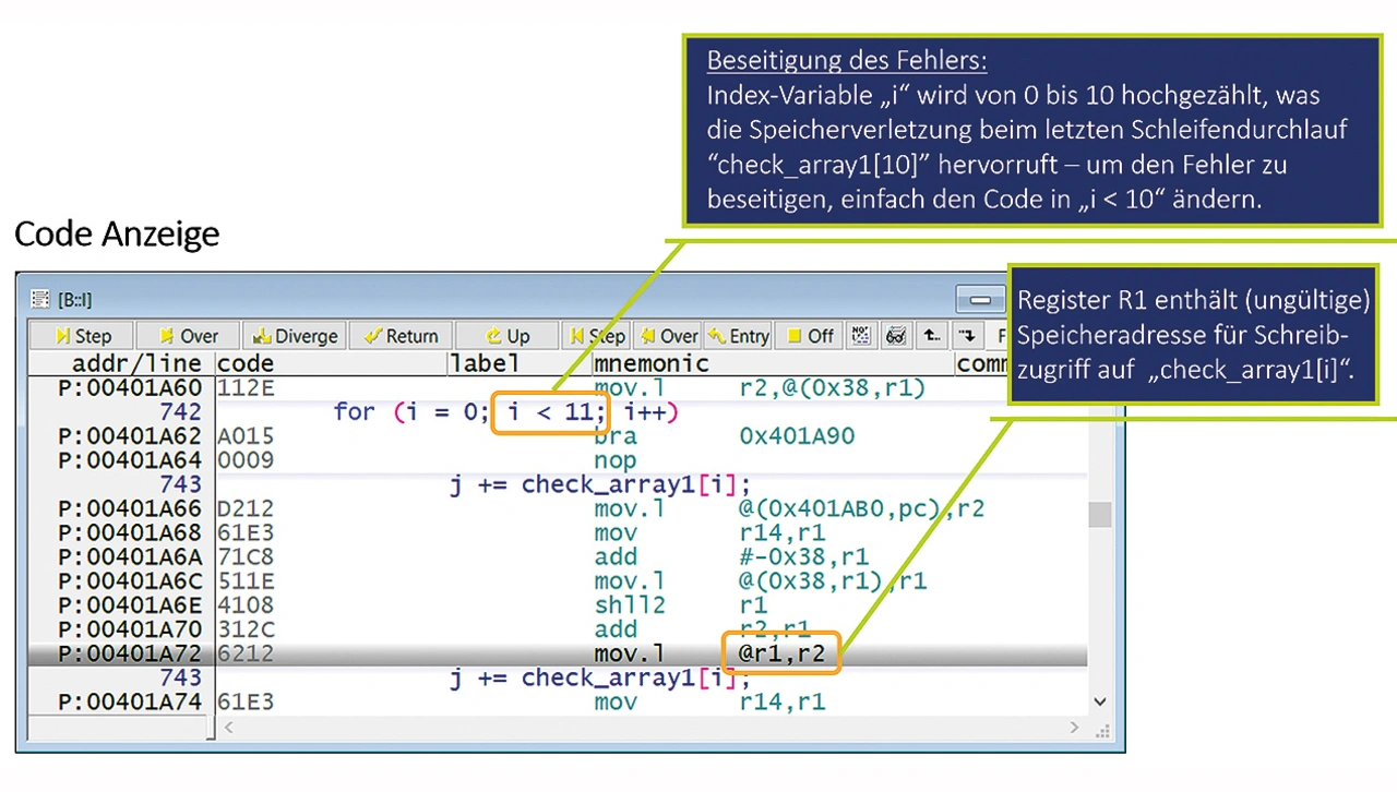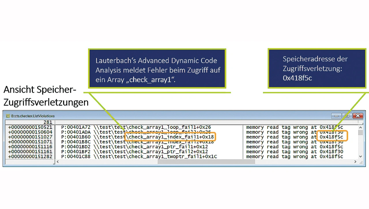 Der ADCA-Bericht zeigt eine Zusammenfassung aller möglichen Speicherzugriffsfehler (Bild 9). Ein konkretes Beispiel aus dem Bericht wird im Folgenden diskutiert: Ein Fehler beim Zugriff auf ein Array namens »check_array1« zusammen mit der Speicheradresse der Zugriffsverletzung (0x418f5c).