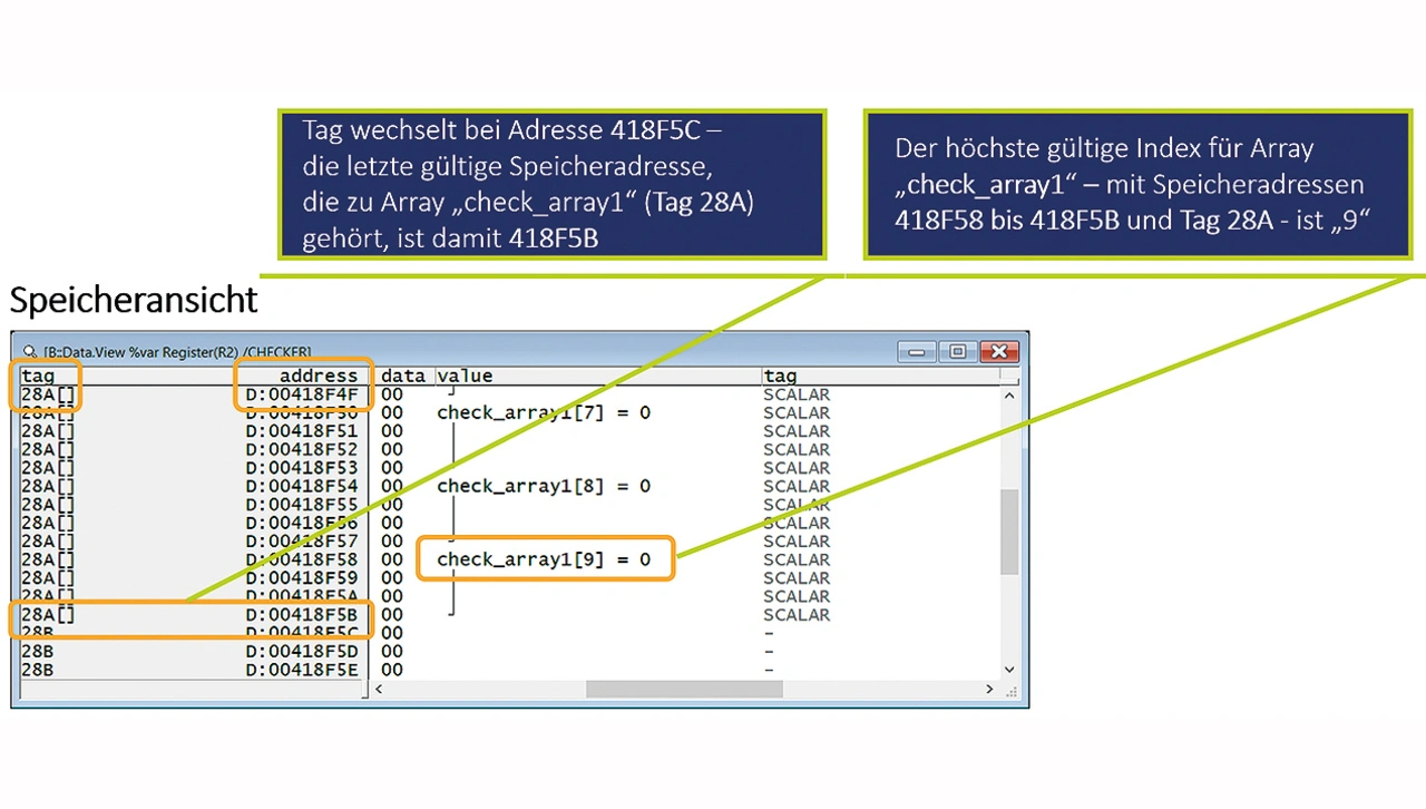 Die erste aller möglichen Ansichten von TRACE32 PowerView aus den in Bild 8 gezeigten Möglichkeiten soll die Speicheranzeige (Bild 10) sein. Im linken Teil der Anzeige ist ein Tagwechsel an der Adresse 418F5C zu beobachten. Die letzte gültige Speicheradresse, die dem Array »check_array1« (Tag 28A) zugeordnet ist, ist also 418F5B. Im mittleren Teil der Speicheranzeige ist zu erkennen, dass der höchste gültige Index für »check_array1« – verbunden mit den Speicheradressen 418F58 bis 418F5B und Tag 28A – »9« ist. Diese Informationen sind wertvoll für die Fehlererkennung, aber sie reichen natürlich noch nicht aus, um den Fehler zu beheben.