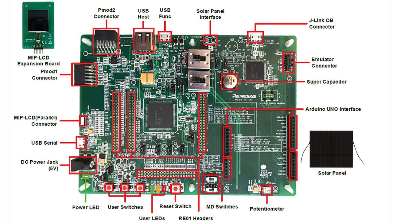 Das von Renesas angebotene Kit mit der Bezeichnung Evaluation Kit RE01 1500KB besteht aus einer Platine mit einem Cortex-M0+-Mikrocontroller. Er enthält 1,5 MByte Flash-Speicher, 256 kByte SRAM, eine Real Time Clock, einen LCD-Controller, eine 2D-Graphics Engine, einen 14 bit ADU mit maximal elf Kanälen (auflösungsabhängig), und als Schnittstellen sind UART, I2C und SPI sowie USB 2.0 integriert.