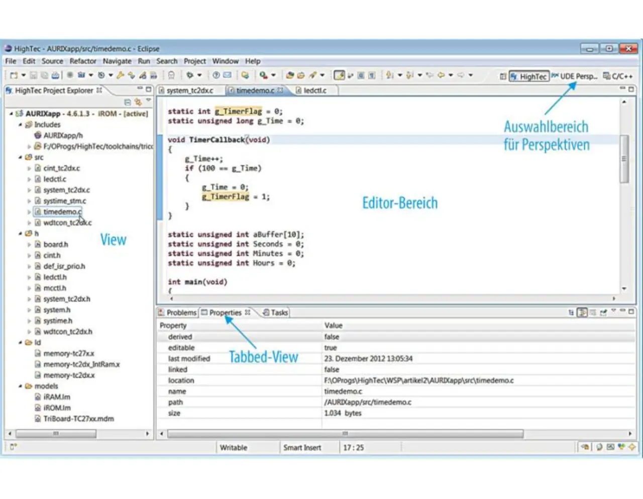 Editoren nehmen typischerweise einen großen Teil der Bedienoberfläche ein, wobei parallel mehrere Quelltexte oder Diagramme geöffnet sein können. Eine Reiteransicht mit sogenannten Tabs am oberen Rand sorgt für einen schnellen Zugriff. Das eigentliche Editor-Fenster ist von einer weiteren Fensterart, den sogenannten Views, umgeben, in denen zusätzliche Informationen angezeigt werden. Beispiele dafür sind ein Projektbaum mit allen zugehörigen Dateien, eine Explorer View zur Darstellung von Klassen, Funktionen, Variablen oder Typ-Hierarchien sowie Fenster, die das Ergebnis eines Build-Laufes oder Suchergebnisse anzeigen und eine direkte Navigation zur jeweiligen Quelltextstelle ermöglichen (Bild 1).