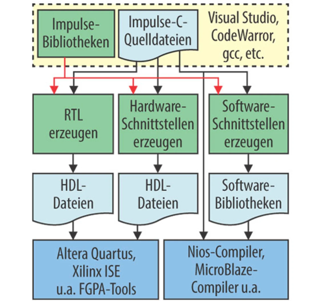 Hierbei wird stets derselbe C-Code von Impulse C verarbeitet, nur die Einstellungen für Hardware- und Software-Targets sind unterschiedlich. FPGAs sind durch die ihnen innewohnende Parallelität schneller als hochgetaktete Universal-Prozessoren. Mit Impulse C kann diese Parallelität in vergleichsweise einfacher Weise evaluiert und erschlossen werden - sowohl auf der Ebene des Gesamtsystems als auch auf Befehlsebene. Für letztes bietet der Impulse-C-Compiler Optimierungen wie „operator scheduling“, das Auflösen von Schleifen und Pipelining. Wenn die C-Debugging-Werkzeuge nicht ausreichen oder das Projekt umfangreich getestet werden soll, bietet Impulse mit dem CoValidator ein Testwerkzeug an, das neben der Erzeugung von Testfällen auch eine VHDL-Simulation durchführt.