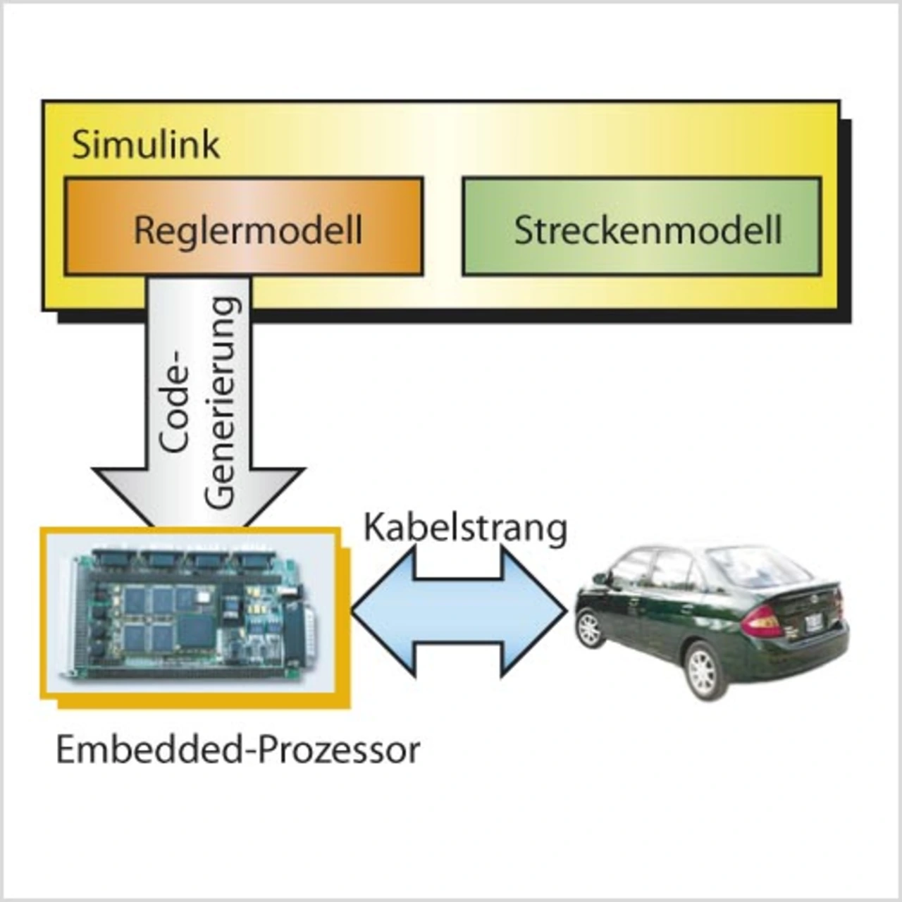 Beim On-Target Rapid Prototyping (Bild 2) wird die automatisch generierte Software für die gleiche oder eine sehr ähnliche Umgebung implementiert, wie sie später in der Serienproduktion zum Einsatz kommt. Dabei wird ermittelt, ob die Regelstrategie für die tatsächlich verwendete Produktions-Hardware geeignet ist. Beim On-Target Rapid Prototyping wird der Code auf den Embedded-Prozessor heruntergeladen, wodurch die Möglichkeit besteht, Tests schnell und mit der tatsächlichen Umgebung oder mit einem Serienfahrzeug durchzuführen. Wenn der Regel-Algorithmus auf dem Target eine akzeptable Leistung liefert, ist er für den Produktionseinsatz geeignet.