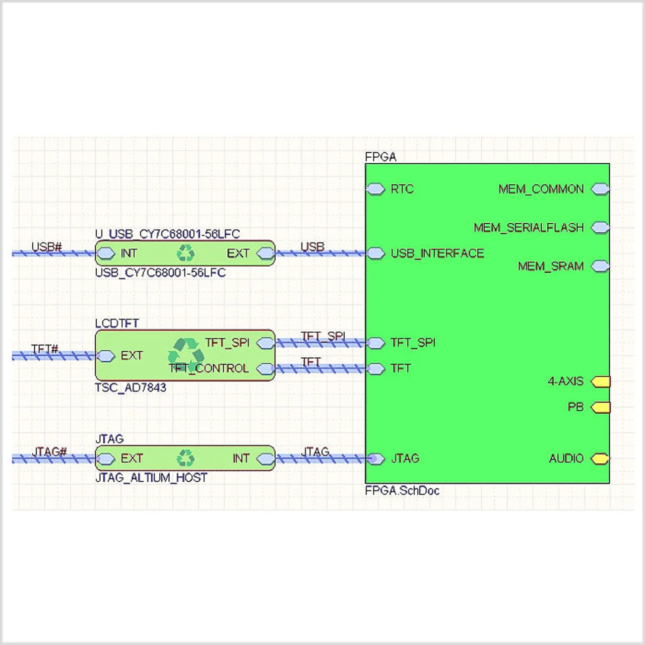 Im Handumdrehen kann so z.B. die Hardware für einen USB-Anschluss und einen Touchscreen zu einem Design hinzugefügt werden. Mit dem entsprechenden Befehl können die geeigneten Device-Sheet-Symbole platziert werden. Signalbündel (Signal Harnesses) sind eine ideale Ergänzung für Device-Sheets. Sie bündeln Netze und Busse zusammen, so dass strukturelle Schaltplanblätter klar und übersichtlich bleiben.