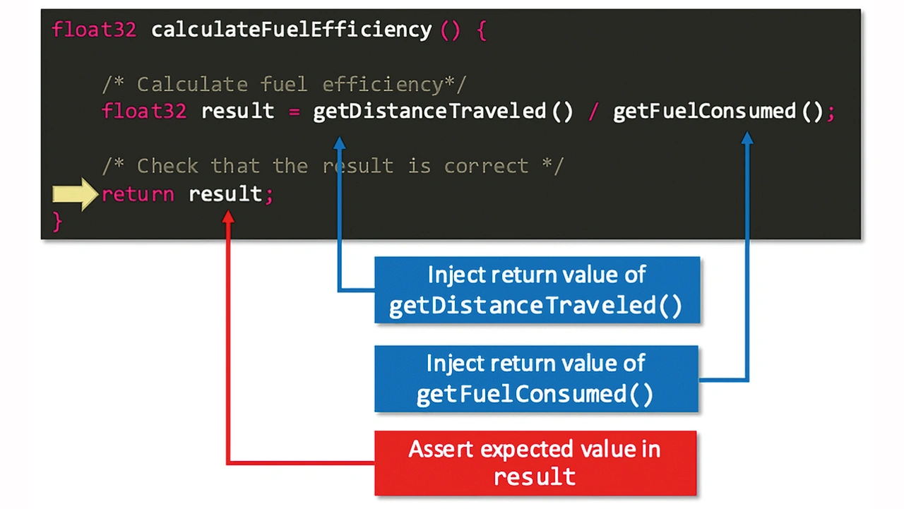 Für ein besseres Verständnis, wie ein Unit-Test auf einem realen Ziel ohne Code-Instrumentierung ausgeführt wird, soll der Unit-Test für die C-Funktion »calculateFuel- Efficiency« als konkretes Beispiel (Bild 3) dienen. Beim Einsatz eines Debuggers ist nicht die gesamte Applikation bis zum Funktionsaufruf auszuführen. Der Debugger kann den Instruction Pointer der CPU direkt auf den Funktionseinstieg setzen. Gemäß den C-Aufrufkonventionen richtet der Debugger den Stack-Frame für die Funktion ein und startet dann die CPU. Ist ein Stubbing oder eine Dateninjektion erforderlich, zum Beispiel wenn Unterfunktionen aufgerufen werden, stoppt der Debugger die CPU. Anstatt die Unterfunktionen aufzurufen, überspringt die CPU beide Funktionen und injiziert stattdessen den gewünschten Rückgabewert direkt in das dafür vorgesehene CPU-Register.