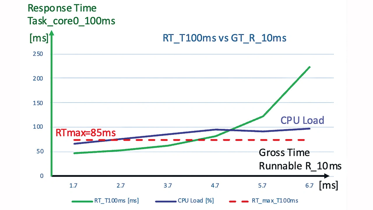 Ein beispielhaftes Ergebnis ist in Bild 5 dargestellt: Die grüne Kurve zeigt die Antwortzeit des 100-ms-Task gegenüber der Laufzeit der 10-ms-Runnable. Angenommen, der 100-ms-Task hat die zeitliche Einschränkung, dass die Antwortzeit 85 ms nicht überschreiten darf: Die Zeitbeschränkung lässt sich erreichen, solange die Laufzeit der 10-ms-Runnable unter 4,5 ms bleibt. Interessant ist außerdem, dass die Antwortzeit an einem bestimmten Punkt fast exponentiell ansteigt und an dem Punkt auch die CPU-Last nicht mehr zunimmt. Das ist ein klares Indiz dafür, dass das Betriebssystem-Scheduling nicht mehr wirklich zuverlässig funktioniert, da das System bereits überlastet ist.