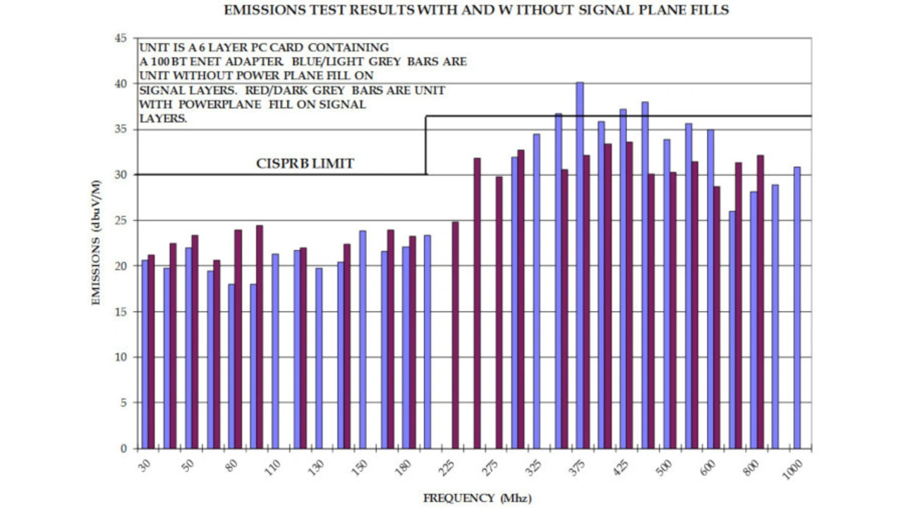 In Bild 11 sind die Vorher- und Nachher-Ergebnisse eines EMI-Tests der Baugruppe mit der Leiterplatte aus Bild 10 dargestellt. Die blauen Frequenzen zeigen die EMI vor dem Hinzufügen der in Bild 8 gezeigten Signallagen mit Kupferfüllung und die roten Frequenzen die EMI nach dem Hinzufügen der Signallagen mit Kupferfüllung.