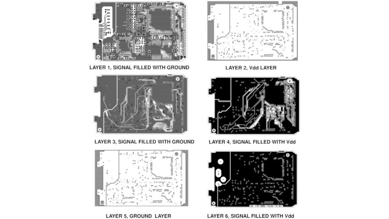 Die sechs Lagen des Leiterplattenaufbaus aus Bild 9, mit den mit zusätzlichen Flächen gefüllten Signallagen, sind in Bild 10 dargestellt.