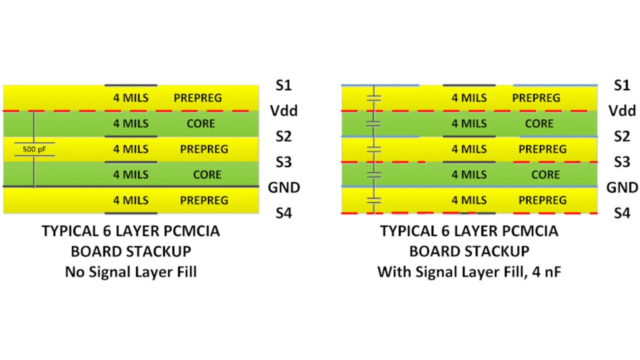 Die Kupferfüllungen, die auf jeder der vier Signallagen aufgebracht werden, sind mit den entsprechenden Stromversorgungslagen verbunden. Dadurch liegt die Stromversorgungsebene nahe an einer Ebene mit entgegengesetzter Polarität auf der angrenzenden Leiterplattenlage, so dass ein interplanarer Kondensator entsteht, der vorher nicht vorhanden war. Auf diese Weise lassen sich fünf Kondensatoren erstellen, wie in Bild 9 rechts dargestellt, im Gegensatz zu nur einem, wie in Bild 9 links. Das Ergebnis könnte möglicherweise eine Erhöhung der Ebenenkapazität von zuvor nur 0,5 nF (Bild 9 links) auf mehr als 4 nF (Bild 9 rechts) sein.