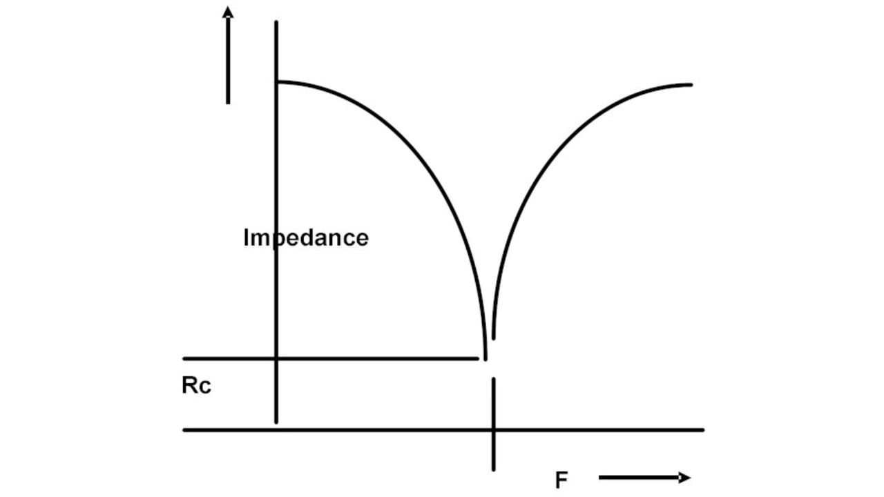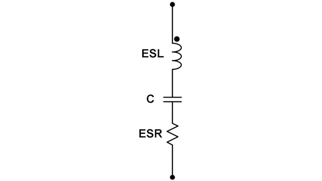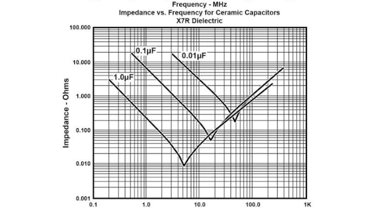Zu beachten ist, dass sowohl bei niedrigen als auch bei hohen Frequenzen die Impedanz sehr hoch ist. Der untere Teil der Kurve wird als Reihenresonanz bezeichnet. Bei der einen Frequenz heben sich die Blindwiderstände der Induktivität und der Kapazität gegenseitig auf, und die resultierende Impedanz ist der äquivalente Serienwiderstand ESR. Bei dieser Frequenz ist es am einfachsten, Ladung in den Kondensator einzuspeichern und sie zur Unterstützung der Schaltvorgänge zu entnehmen. Bei Werten oberhalb und unterhalb der Reihenresonanz kann der Kondensator nicht an den Schaltvorgängen teilnehmen.