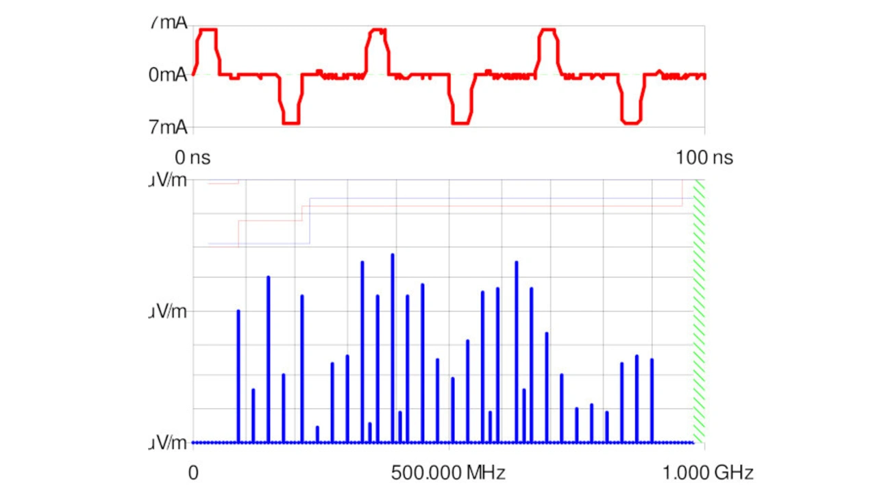Der rote Signalverlauf in Bild 5 oben ist der Stromverlauf, wobei die positiv-verlaufende Auslenkung die Stromentnahme aus der Stromversorgung beim Umschalten von 0 auf 1 und die negativ-verlaufende Auslenkung die Entladung der parasitären Kapazität der Leitung beim Umschalten von 1 auf 0 darstellen. Es gilt zu beachten, dass die erste Frequenz ca. 85 MHz (Bild 5 unten) beträgt. Es handelt sich nicht um eine Harmonische der 30-MHz-Taktfrequenz und es gibt keine Harmonischen der 30-Taktfrequenz im Spektrum.