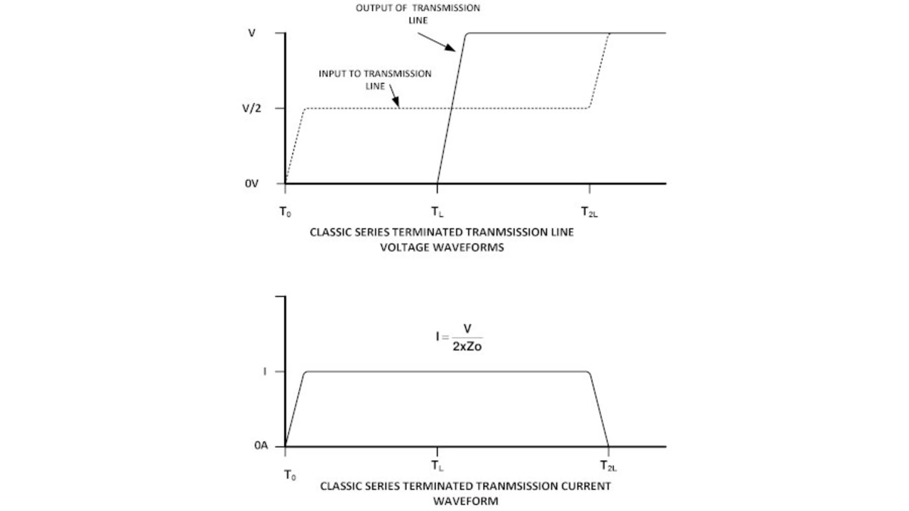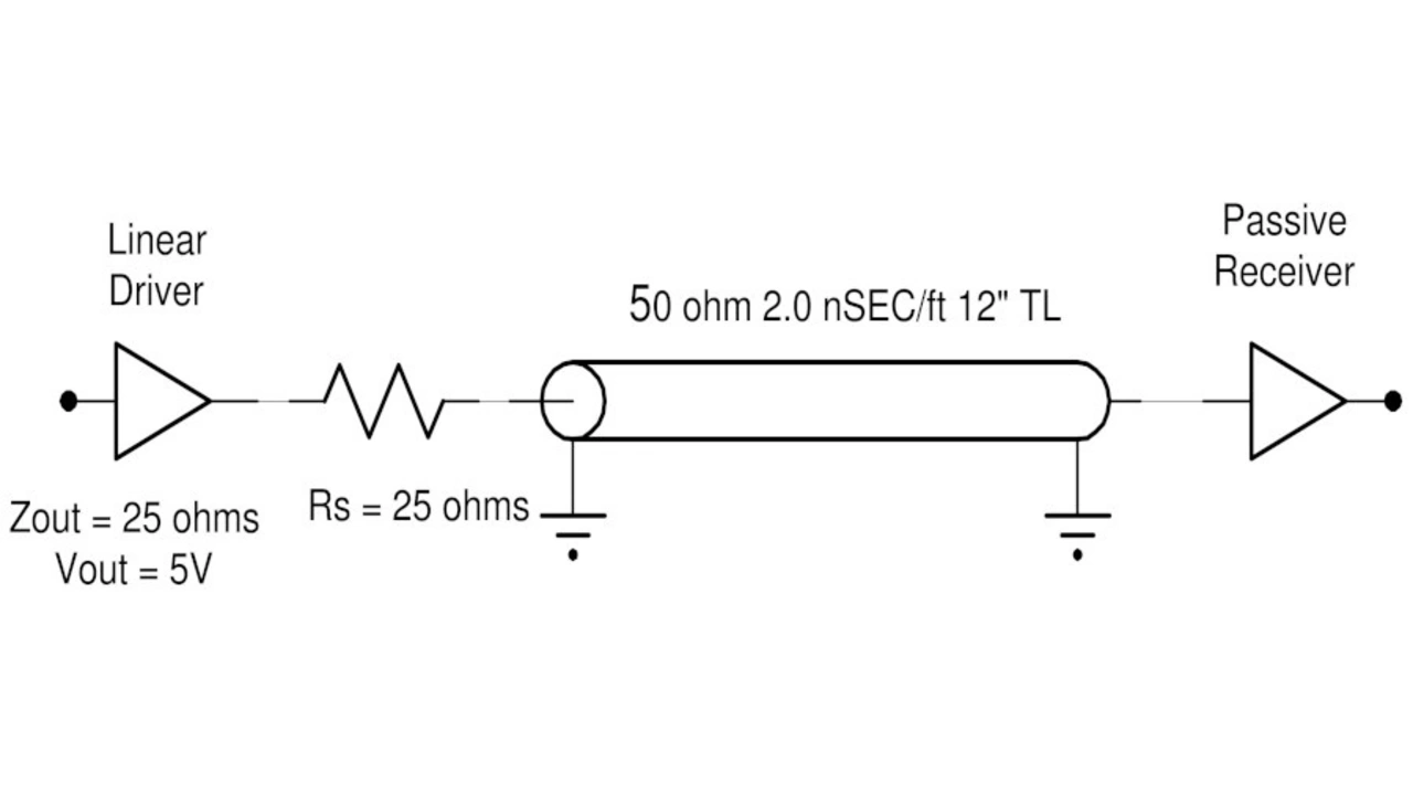 Um die Ursache dieses Problems zu verstehen, bietet es sich an, zu untersuchen, was passiert, wenn Signale mit hoher Datenrate von einer logischen 0 zu einer logischen 1 wechseln. Die meisten CMOS-Logiksignale werden, wie in Bild 2 dargestellt, mit einem in Reihe geschalteten Widerstand zur Impedanzanpassung übertragen.