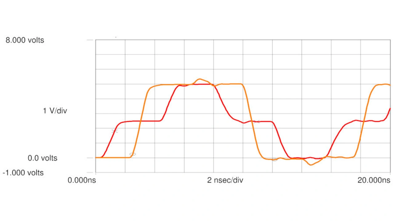 Wenn ein logischer Zustand von 0 auf 1 wechselt, ist Strom oder Ladung aus der Stromversorgung erforderlich. Bild 3 zeigt den Spannungsverlauf am Treiberausgang (rot) und an der Last bzw. am Eingang (gelb) für die in Bild 2 gezeigte Schaltung. Wenn das 1-Signal über die Übertragungsleitung läuft, wird die parasitäre Kapazität der Übertragungsleitung auf UB geladen, indem Ladung von der Kapazität der Stromversorgung auf die Leitungskapazität übertragen wird.