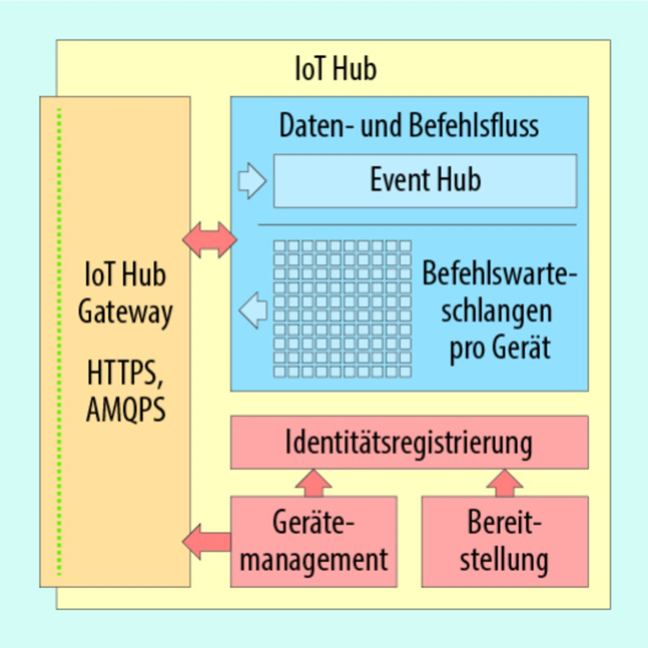 Azure IoT ist Microsofts Public-Cloud-Plattform für Entwickler und Administratoren, die eigene Software-Anwendungen in der Cloud ausführen möchten. Die Plattform umfasst eine Reihe von Diensten, die einzeln oder in Kombination genutzt werden können. Azure IoT Hub bietet dabei eine einfache und sichere Möglichkeit, Millionen von IoT-Geräte anzuschließen, bereitzustellen, zu verwalten und mit diesen bidirektional zu kommunizieren (Bild 9). Der IoT Hub ist die Brücke zwischen Geräten und entwickelten Lösungen in der Cloud, sodass Daten in Echtzeit gespeichert und analysiert werden können. Dabei werden eine beliebig große Speicherkapazität sowie andere Dienstleistungen bereitgestellt und nutzungsabhängig abgerechnet (automatische Skalierung).