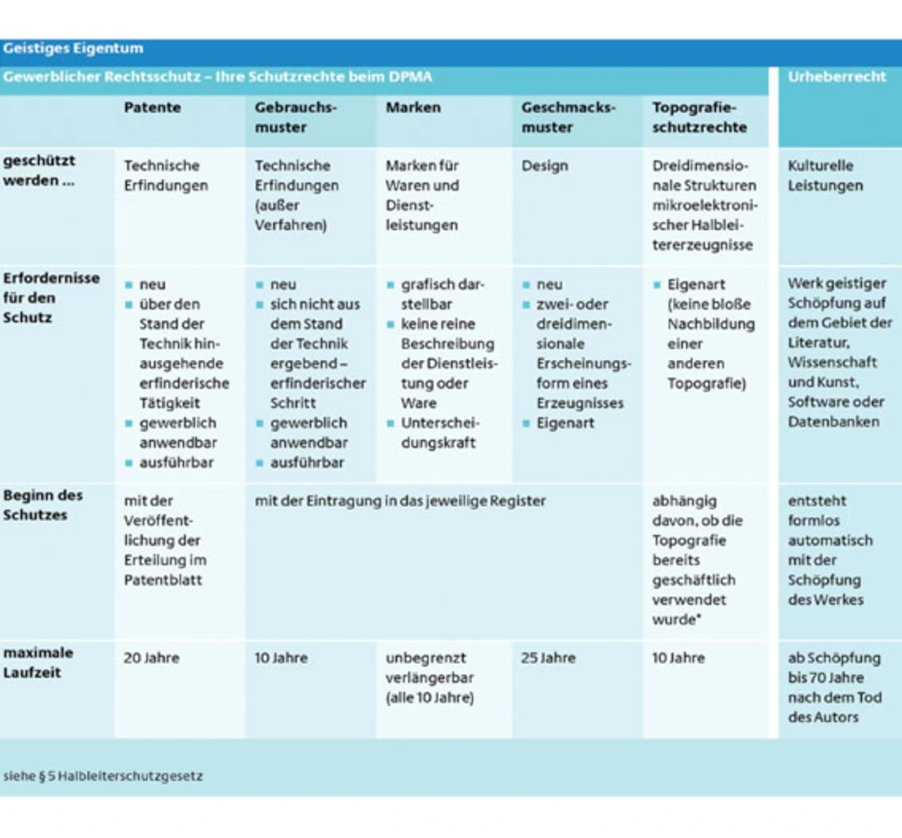 Allen ist gemein: Wirtschaftlich erfolgreiche Erfindungen und Ideen werden häufig nachgeahmt. Effektives Vorgehen gegen Plagiate und Imitationen ist vor allem mit Hilfe gewerblicher Schutzrechte möglich. Für den Erfinder und den Unternehmer sind damit viele Fragen verbunden: Wie schütze ich mein Produkt vor Nachahmern? Welches Schutzrecht ist das richtige? Das Deutsche Patent- und Markenamt (DPMA) schützt technische Erfindungen als Patente oder Gebrauchsmuster, trägt Marken und Muster für Produkte oder Dienstleistungen ein und bietet mit dem Geschmacksmuster Schutz für das Design eines Produkts.