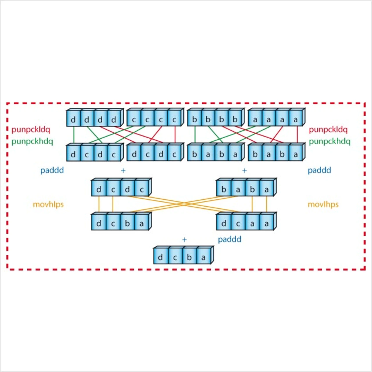Als letzter Schritt verbleibt das Ersetzen der bequemen, aber langsamen phaddd-Befehle durch schnellere Alternativen. Eine Kaskade von drei horizontalen Additionen (wie in Bild 4 rot umrandet) kann durch eine längere und trotzdem schnellere Befehlsfolge (wie in Bild 5 illustriert) ersetzt werden. Die verwendeten Befehle sind in [1] beschrieben. Mit diesem letzten Optimierungsschritt gelingt es, die Berechnungszeit für 640 Werte eines FIR-Filters 63. Ordnung auf ca. 13 680 CPU-Zyklen zu reduzieren. Die noch bestehende Lücke zum theoretischen Limit von 10 240 Zyklen ist zum Großteil algorithmisch bedingt (das zur Optimierung der Speicherzugriffe eingeführte Padding der Filterkoeffizienten erzwingt zusätzliche Berechnungen, die nicht zum Ergebnis beitragen). Hinzu kommt ein gewisser Aufwand für Akkumulation, Skalieren und Abspeichern der Ergebnisse. Die Optimierung eines FIR-Filters für die Atom-Architektur wurde hier an einem 16-bit-Fixpoint-Filter 63. Ordnung beschrieben. Die Leistung des Filters wurde mehr als verfünffacht und bis auf wenige Prozent an das theoretisch mögliche Maximum herangeführt. Gelungen ist das durch Ausrollen der Programmschleifen, konsequenten Einsatz von SSE-Instruktionen, Berücksichtigung der Speicher-Alignment-Anforderung sowie geschickte Auswahl der schnellsten (statt der naheliegendsten) SSEBefehle.