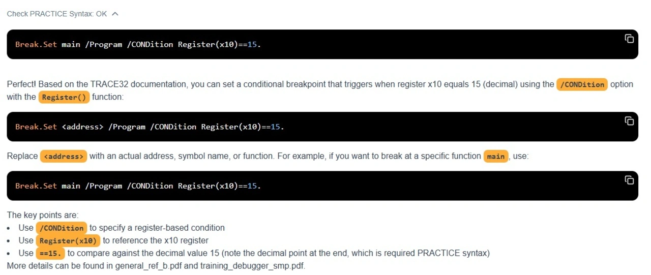 Den zweiten Anwendungsfall sieht Lauterbach in der täglichen Arbeit auch bei erfahrenen Entwicklern. Mario Fleischmann, Embedded Systems Engineer bei Lauterbach, erklärt: »TRACE32 bietet zahlreiche Features, die die Fehlersuche erheblich erleichtern können. Unser KI-Assistent kann dabei helfen, die relevanten Features für den aktuellen Use-Case zu identifizieren.« Entwickler können derartige Aktivitäten zwar schon heute über die TRACE32-GUI oder die Kommandozeile vornehmen, wozu sie aber die entsprechenden Befehle im Kopf haben und diese dann auch noch fehlerfrei eintippen müssen. Wenn sie stattdessen dem Chatbot beispielsweise sagen: »I want to set a conditional breakpoint that only triggers when register x10 is 15 (decimal)« bekommen sie auf Basis der umfangreichen TRACE32-Dokumentation nicht nur den entsprechenden Befehlstext einschließlich Syntaxcheck zurückgeliefert (Schaubild 2), sondern können in der Chatbot-App sogar per Knopfdruck die Ausführung in der TRACE32-Software automatisch starten.