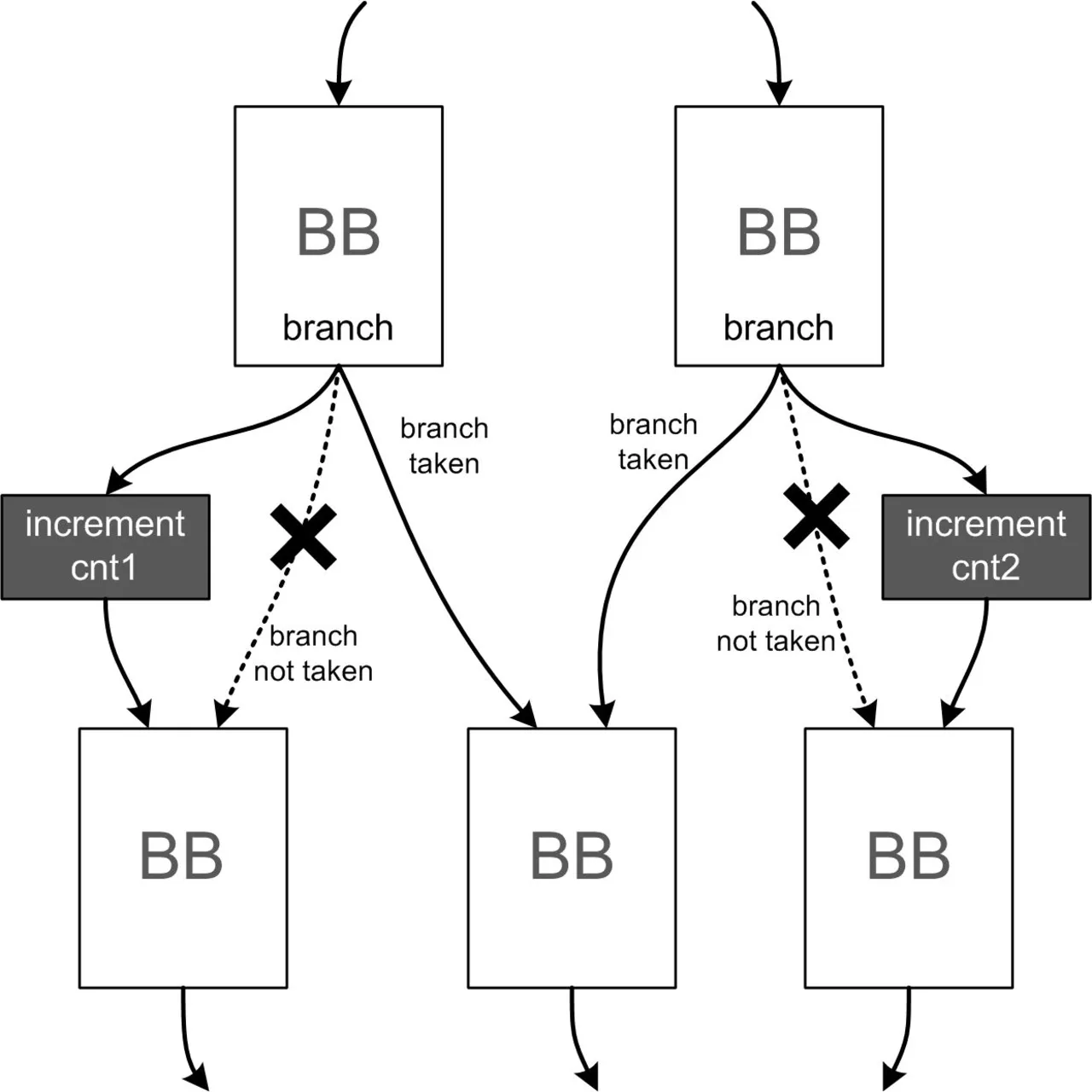 Um bei der Code-Optimierung auch solche Effekte berücksichtigen zu können, gilt es erst einmal, Informationen über das Laufzeitverhalten zu sammeln. Ein »Application Profiling« zeigt, welche Wege das Programm durch seinen Kontrollflussgraphen (CFG) bevorzugt. Letzterer beinhaltet alle möglichen Wege durch das Programm in Form von Kanten, die wiederum die Basisblöcke (Knoten) miteinander verbinden. Basisblöcke sind linear hintereinander ausgeführte Sequenzen von Maschinenbefehlen, die keine Verzweigung durch einen Sprung oder Call beinhalten. Die »Coverage-Analyse«, ein Verfahren, das beispielsweise für das Profiling im »GNU-Compiler« zur Anwendung kommt, instrumentiert nun alle Kanten, die für eine spätere Rekonstruktion des Kontrollflusses nötig sind (Bild 2). Die Instrumentierung fügt eine Codesequenz in die jeweilige Kante ein und allokiert gleichzeitig einen Speicherplatz im Target-Speicher, der einen Zähler enthält. Beim Beschreiten der Kante wird gleichzeitig der zugehörige Zähler inkrementiert.