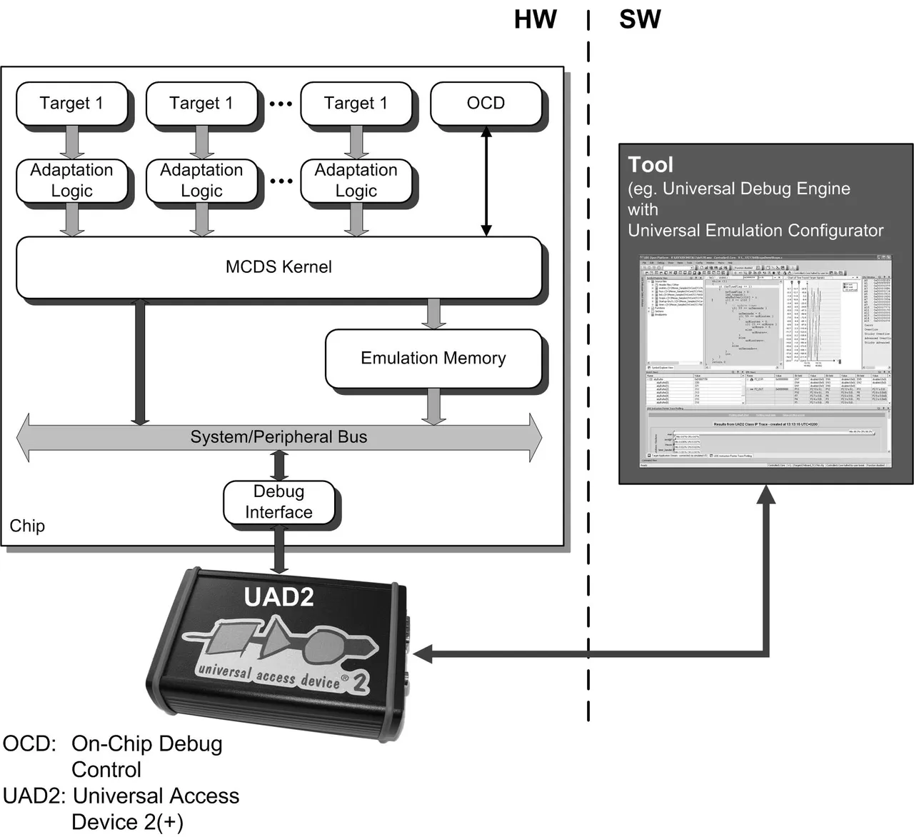 Letztere wird uns für die nachfolgenden Ausführungen als Referenzplattform dienen. Mit MCDS (Bild 3) lassen sich unter anderem die abgearbeiteten Befehle (Program Trace) zyklengenau aufzeichnen, und es unterstützt mit einer ausgefeilten On-Chip-Trigger- und -Filter-Logik eine gezielte Analyse der Applikation beziehungsweise des gesamten Hard- und Softwaresystems. Die Möglichkeit, bereits während der Aufzeichnung durch die MCDS-Hardware Daten zu filtern, ist enorm wichtig. Zum einen brächten die durch ein ungefiltertes Aufzeichnen zwangsläufig entstehenden großen Datenmengen den verwendeten On-Chip-Trace-Speicher sehr schnell zum Überlaufen. Zum anderen steht über die Debug-Schnittstelle – beispielsweise JTAG – nur eine begrenzte Bandbreite zur Übertragung von Trace-Daten zum Host zur Verfügung, der Anwender hat also keine Möglichkeit, kontinuierlich zu tracen. Neben dem Tracing bietet die MCDS-Hardware noch eine weitere, für die Beobachtung des Laufzeitverhaltens sehr nützliche Funktion: das Zählen von Ereignissen, ohne dass Zählerwerte in den Anwendungsspeicher geschrieben werden müssen. In unserem Fall sind sie Bestandteil der Trace-Ausgabe und lassen sich somit auch mit anderen aufgezeichneten Ereignissen und Trace-Daten korrelieren.