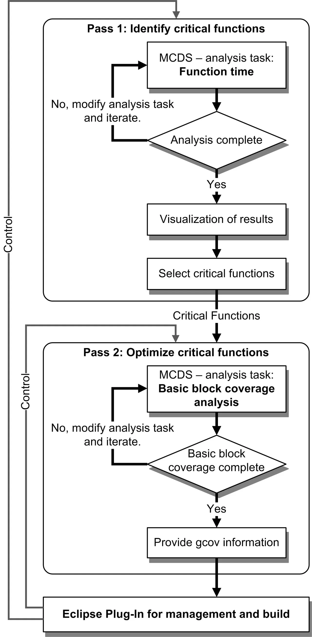 Der industrielle Einsatz des beschriebenen Verfahrens ist nur sinnvoll, wenn sowohl das Applikations-Profiling als auch die Code-Optimierung als Gesamt-Workflow verfügbar sind. Bild 5 zeigt schematisch die zugehörigen Teilkomponenten und ihre Interaktionen. Hervorzuheben ist dabei, dass für den praktischen Einsatz die Coverage-Analyse nicht auf die gesamte Applikation zur Anwendung kommt, sondern in einem ersten Schritt zunächst die tatsächlich laufzeitkritischen Funktionen ermittelt werden. Das kann ebenfalls mit Hilfe der MCDS geschehen. Sind kritische Funktionen identifiziert oder auch vom Benutzer manuell angegeben, starten die weiteren Optimierungsschritte wie Coverage-Analyse und erneute Compilierung. Sollten Optimierungsziele nicht erreicht oder Randbedingungen wie eine beschränkte Codegröße nicht erfüllt werden, kann es notwendig sein, Teile des Workflows mehrfach zu durchlaufen, um beispielsweise die Optimierungseinstellungen des Compilers oder gar die Auswahl der zu optimierenden Funktionen zu ändern.(cg)