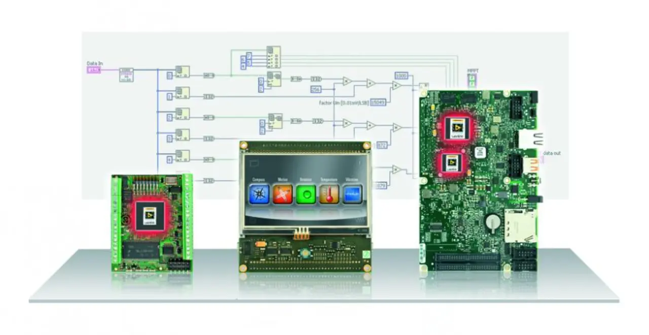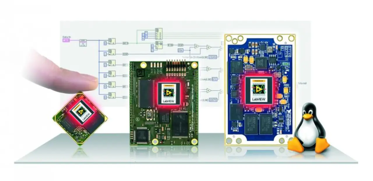 Nahezu jeder am Markt verfügbare I/O-Baustein lässt sich nun an das System anbinden, z.B. über digitales I/O, synchrone (SPI) und asynchrone (UART) serielle Schnittstellen oder parallele High-Speed-Bussysteme. Von der Funktionalität her bietet der Zweiplatinenansatz ähnliches wie bei Singleboard-Computern, lässt sich im Vergleich aber beliebig erweitern. In der LabVIEW-Umgebung steht für jede dieser Hardwarefunktionen ein Virtuelles Instrument (VI=Funktionsblock/Treiber) zur Verfügung. Der Vorteil dabei ist ein nahtloses Anpassen von Hardware in Form und Funktion an jede beliebige Aufgabenstellung. Außerdem müssen zu Beginn der Entwicklung, beispielsweise beim Rapid Prototyping, noch nicht alle Anforderungen in Stein gemeißelt sein, denn Baseboards lassen sich schnell ändern. Diese Flexibilität hat jedoch auch ihren Preis: im Vergleich zum Singleboard-Computer muss beim Zweiplatinenansatz immer zuerst Hardware in Form eines Baseboards entwickelt werden. In den folgenden Abschnitten wird näher auf die Einsteckmodule eingegangen.