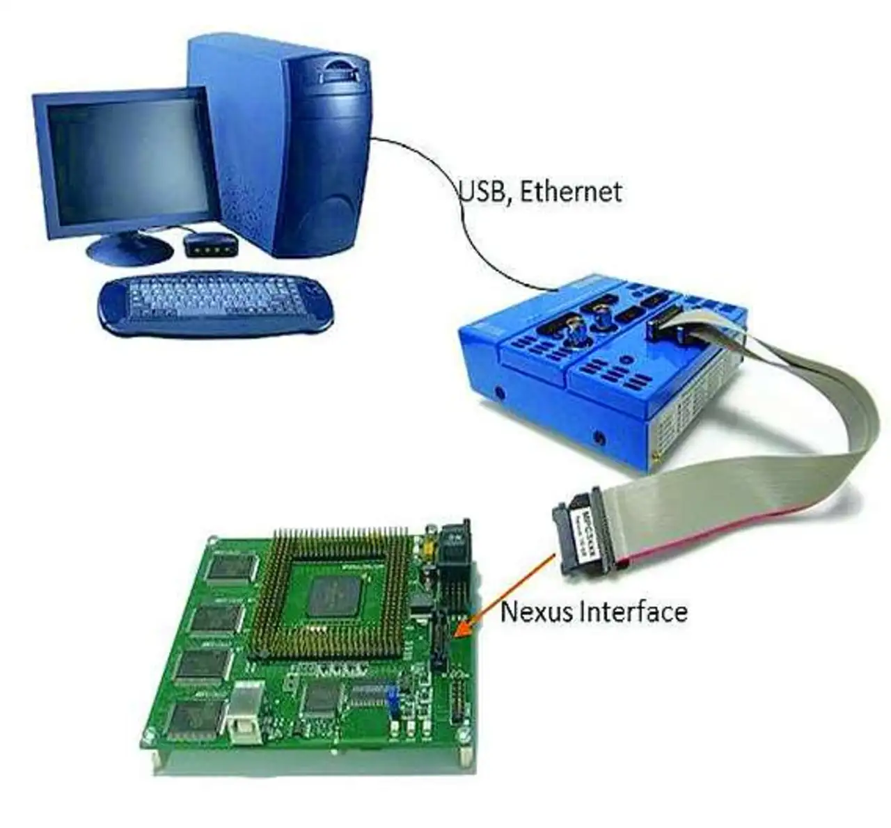 Dieses Board stellt zwei Schnittstellen zur Verfügung, einerseits einen JTAG/OnCE-Port (14 Pins), andererseits ein Nexus-Class-3-Interface (38 Pins). Als Debug-Werkzeug finde der On-Chip-Debugger »iC5000« Verwendung.