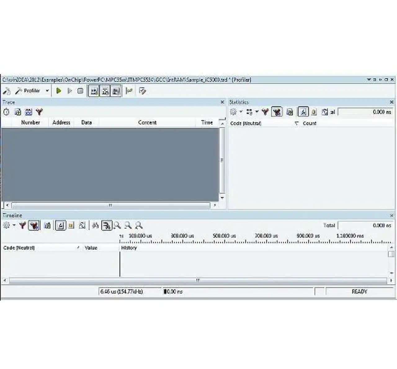 Verbindet man den iC5000 hingegen über die JTAG-Schnittstelle (Bild 3) und startet den Trace, so ist der Trace leer (Bild 4), enthält also keine Information zur Programmausführung oder irgendwelche Daten.