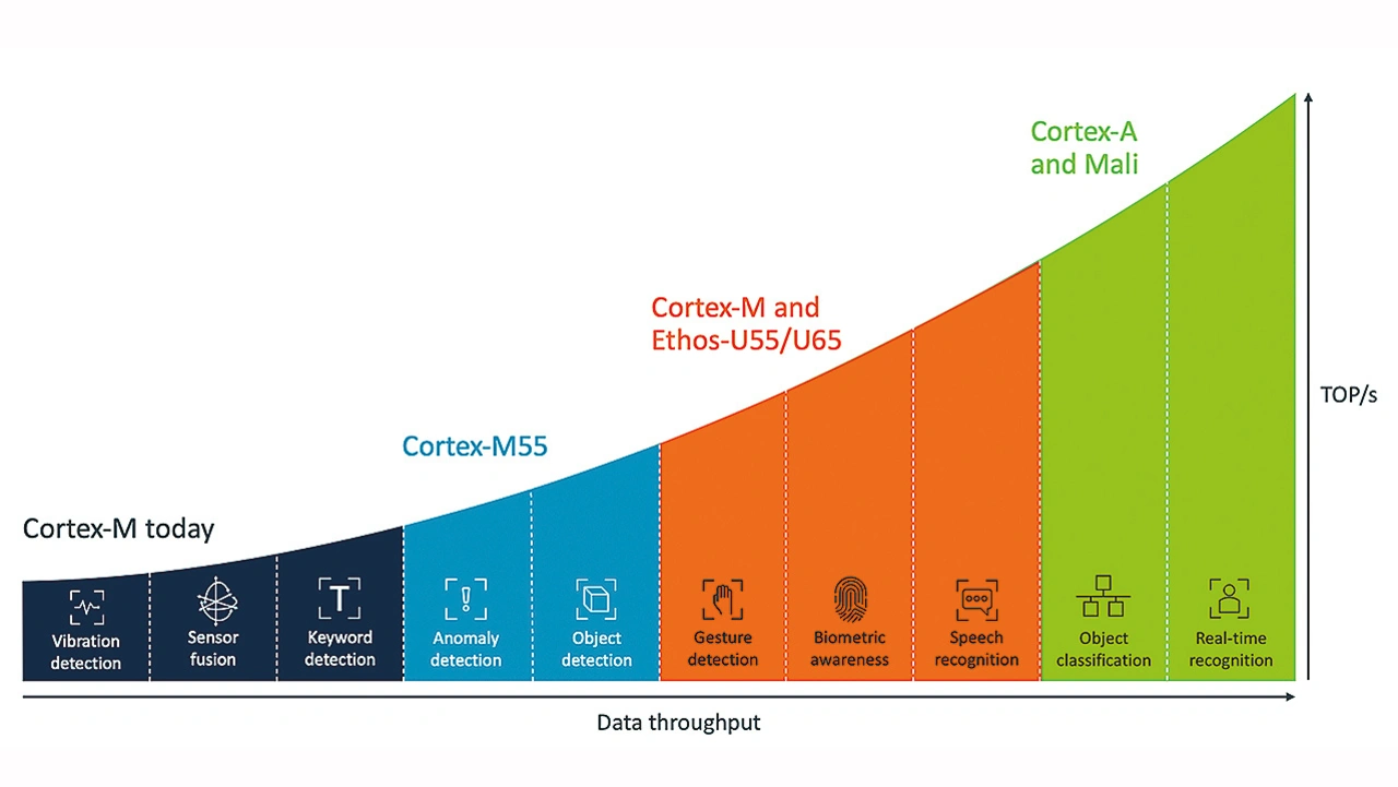 Daher bietet Arm eine breite Palette von optimierten Prozessoren an, die auf Anwendungen des maschinellen Lernens auf Edge-Geräten ausgerichtet sind (Bild 1). Selbst der kleinste Arm-Prozessor, der Cortex-M0/M0+-Prozessor, führt einfache ML-Algorithmen aus. So ist beispielsweise ein vorausschauendes Wartungssystem, das Sensordaten nutzt, mit diesem Prozessortyp möglich.