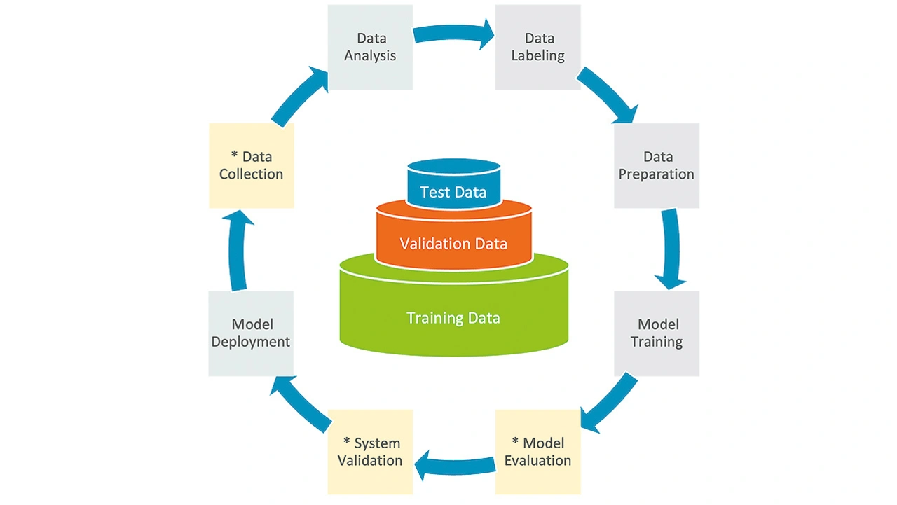 Maschinelles Lernen wird passenderweise mit einem MLOps-Workflow implementiert. MLOps besteht aus einer Reihe von Schritten für die Entwicklung, den Einsatz und die Wartung von Modellen für maschinelles Lernen in Produktionsgeräten. Bild 2 zeigt die wichtigsten Phasen eines MLOps-Entwicklungsprozesses: