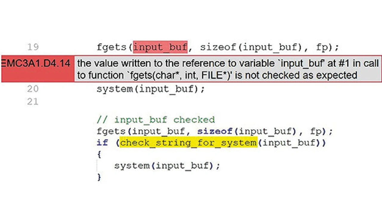 Im obigen Beispiel werden die verschmutzten Daten als Parameter an die Funktion system() übergeben, die diese Daten als Kommando ausführt. Dadurch kann ein beliebiges Kommando ausgeführt werden, was ein hohes Security-Risiko darstellt. Dies führt dazu, dass die Verletzung der Direktive D14.4 aus Amendment 1 von MISRA C:2012 gemeldet wird (Amendment 1 enthält die zusätzlichen Security-Vorgaben, s. o.). Diesen Fall sollte man als Security-Problem betrachten; allein von der Tatsache, dass ein beliebiges Kommando an die Funktion system() zur Ausführung übergeben wird, tritt zwar noch kein undefiniertes Verhalten ein – jedoch kann die Ausführung des Kommandos dazu führen.