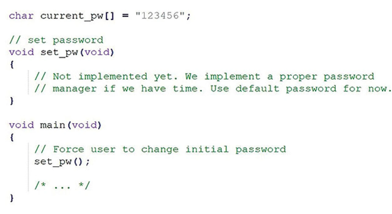 Bild 4 zeigt solch ein Security-Problem, das statische Analysewerkzeuge kaum aufdecken können, nämlich die Benutzung eines fest codierten Passworts. Im obigen Beispiel wird das initiale Passwort fest auf den Wert »123456« gesetzt. Es war wohl beabsichtigt, ein Passwort-Management zu implementieren, aber aus irgendwelchen Gründen ist dies unterblieben. Das führt dazu, dass alle Systeme (z.B. Webcam) mit demselben einfachen, bekannten Passwort ausgeliefert werden. Das ist nun definitiv ein Security-Problem und kein Programmierfehler. Ein statisches Analysewerkzeug kann nicht wissen, dass eigentlich ein Passwort-Management implementiert werden sollte, und kann deswegen nichts melden. Vielleicht moniert es die leere Funktion set_pw(), aber diese und ihr Aufruf muss es ja nicht geben, sie könnten komplett fehlen. Abhilfe schaffen eine Anforderung (Requirement) nach dem Passwort-Management und Tests, die sie prüfen.