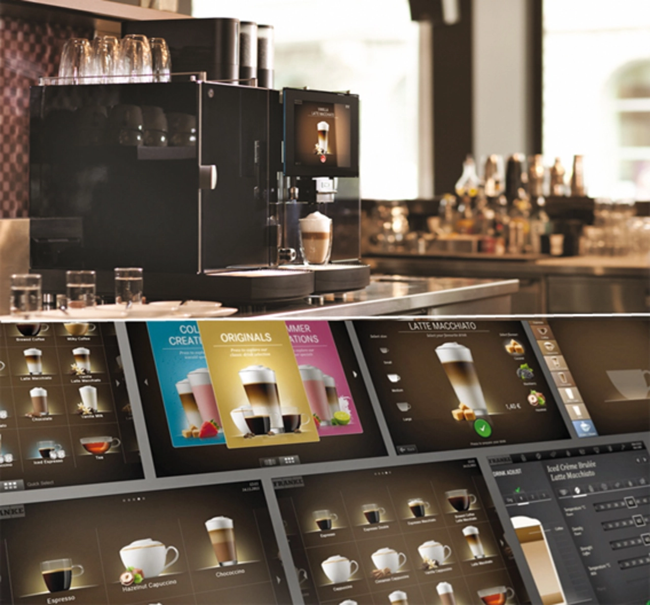Der Vollautomat unterstützt unter anderem zwei Sorten Bohnen, Kakao, Milchschäumer (kalt und warm) sowie bis zu drei Sirup-Zusätze. Für die Bedienung, aber auch die Inbetriebnahme, Kalibrierung und Wartung der FM800 setzten die Entwickler der Bedienoberfläche folgende verschiedene Bildschirminhalte (Screens) um: