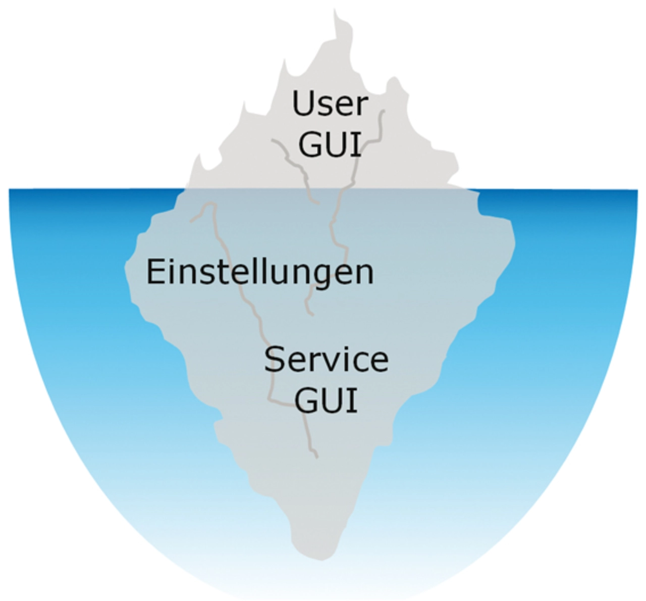 Der sogenannte »Eisberg-Effekt« ist im Zusammenhang mit vielen Softwarepaketen bekannt: Wie beim Eisberg, von dem nur ein Bruchteil über der Wasseroberfläche liegt und somit sichtbar ist, nutzen durchschnittliche Anwender meist nur einen kleinen Teil der Funktionen eines mächtigen Programms. Auch auf die Disziplinen Schnittstellenentwicklung und GUI-Programmierung (Graphical User Interface) trifft der Eisberg-Effekt meist zu: 20% des Umfangs einer Entwicklung bedient der Anwender im normalen Betrieb, 80% verstecken sich in Service-, Einstellungs- und Wartungsmenüs (Bild 2). Dabei sind die 20% meist gut beschrieben, bis ins Kleinste vom Usability-Experten und Schnittstellenentwickler ausgearbeitet und vom Kunden bestmöglich spezifiziert.