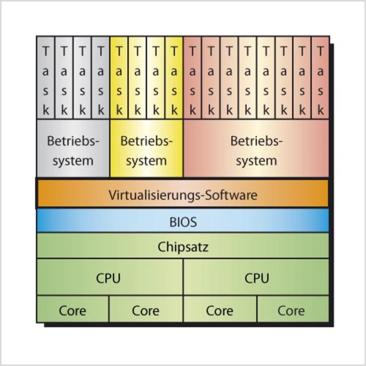 Bild 2 zeigt ein Beispiel dafür, wie die über einem BIOS laufende Virtualisierungs-Software verschiedene Aufgaben der Anwendung auf mehr als einem Betriebssystem in einer Multi-Core-Umgebung unterstützt. In dieser Konfiguration müssen CPU, Chipsatz und BIOS alle mit der Multi-Core- und der Virtualisierungstechnik kompatibel sein. Für die Software-Entwicklung gibt es Tools wie Compiler, Virtualisierungstechnikanalysatoren und Cluster-Tools, die Multi-Core-Anwendungen unterstützen und den Entwicklern helfen, die Erstellung ihres Codes in einer Weise umzustellen, dass er für die Verteilung auf mehrere Cores innerhalb eines Chips oder innerhalb eines Boards geeignet ist, und nicht wie bisher nur für monolithische Single-Thread-Anwendungen.