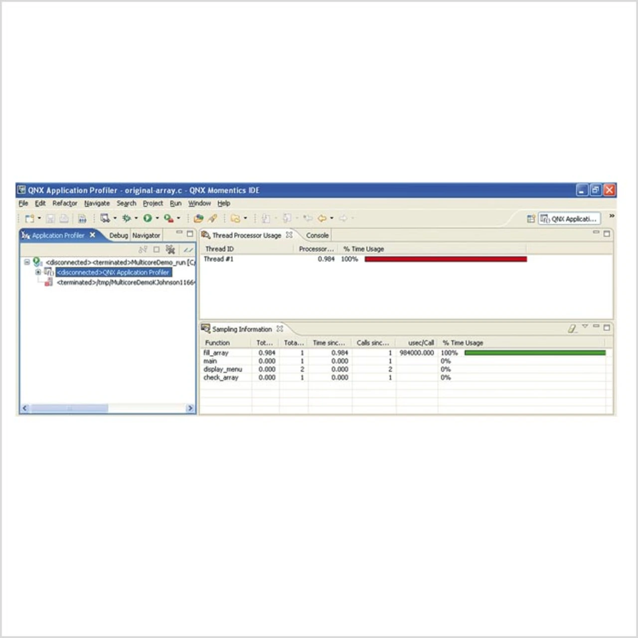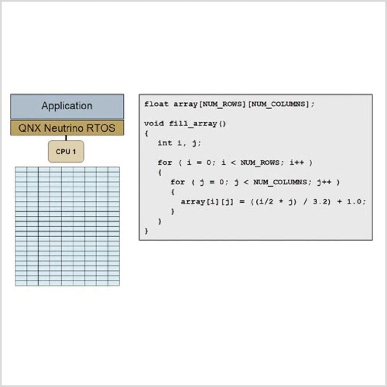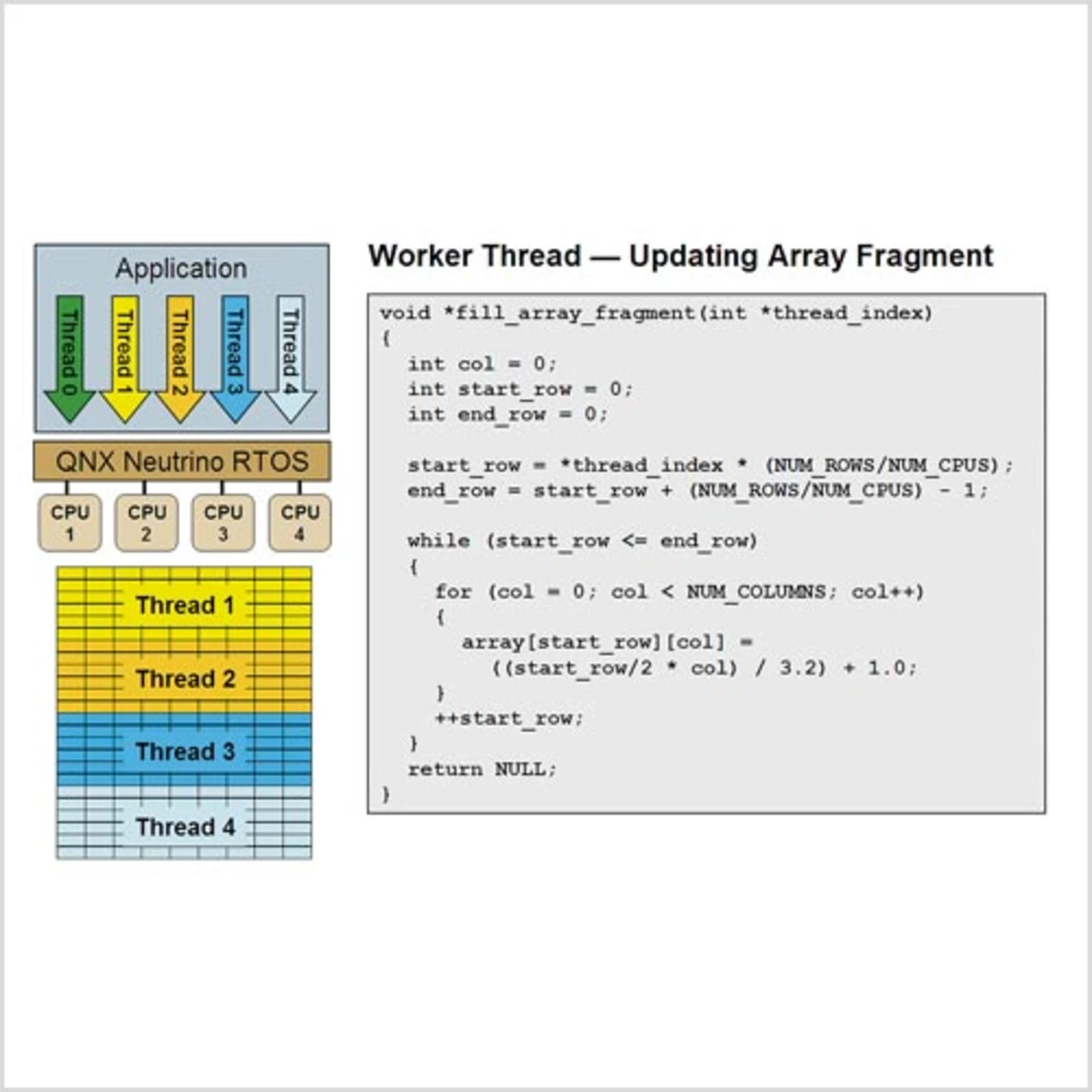 Bild 1 zeigt mit fill_array() eine rechenintensive Funktion, die ein großes zweidimensionales Array bedient. Der Screenshot des QNX Momentics Application Profiler (Bild 2) macht deutlich, dass fill_array() in der Applikation die meiste CPU-Zeit verbraucht. Da fill_array() ein einzelner Thread ist, würde sich die Performance auch dann nicht verbessern, wenn er von einem Uniprozessorsystem auf ein Multicore- System verschoben würde. Wird der Algorithmus in verschiedene Threads gesplittet (Bild 3), kann das Betriebssystem die Rechenlast auf alle verfügbaren Prozessoren verteilen und so die Rechenzeit wesentlich verkürzen. Dies ist ein wichtiger Vorteil der auf symmetrischem Multiprocessing, kurz SMP, basierenden Echtzeit-Betriebssysteme wie dem QNX Neutrino.